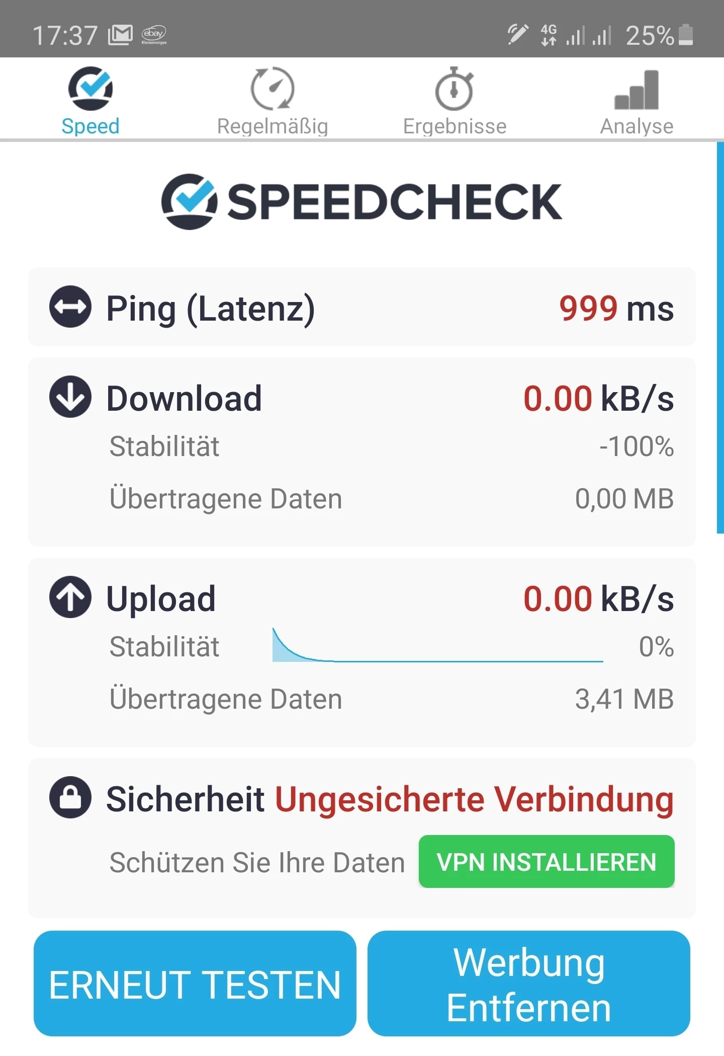 Upload 1048 kbit/s und Ping nicht messbar. Warum auf einmal so ? Verbindung spring von H+ auf E und zurück.