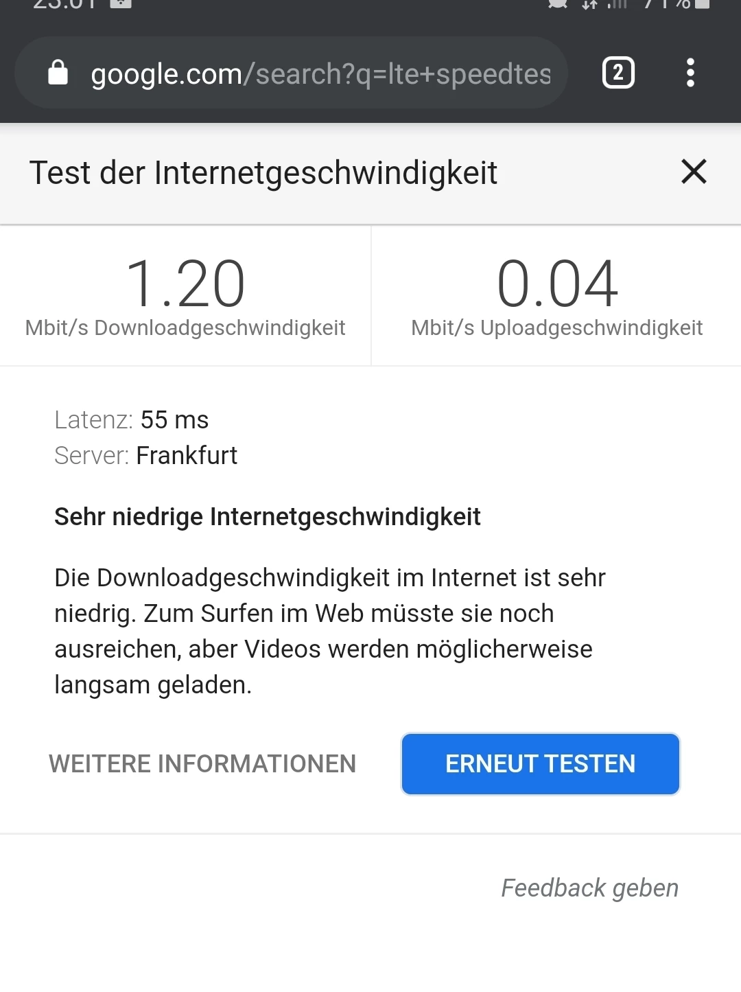 Schon über 2 Wochen Störung! Aber ich kann natürlich warten. Wer braucht schon heute Internet?! Und deine Aussage ist auch schlichtweg falsch. Ich wohne in einer Stadt. Nochmal "DIE GRÖßTE FABRIK DER WELT". Da muss es funktionieren. Wenn ich 5KM über die Landstraße zum einem Stadtteil fahre, bekomme ich ausreichend LTE Geschwindigkeit. In der Innenstadt aber nicht. Ich bin auch Öko. Ich habe auch Geduld. Ich bin für den Weltfrieden usw. Aber über 2 Wochen Störung geht zu weit! Nochmal! Ich wohne in einer Stadt! Und nicht auf dem Land...