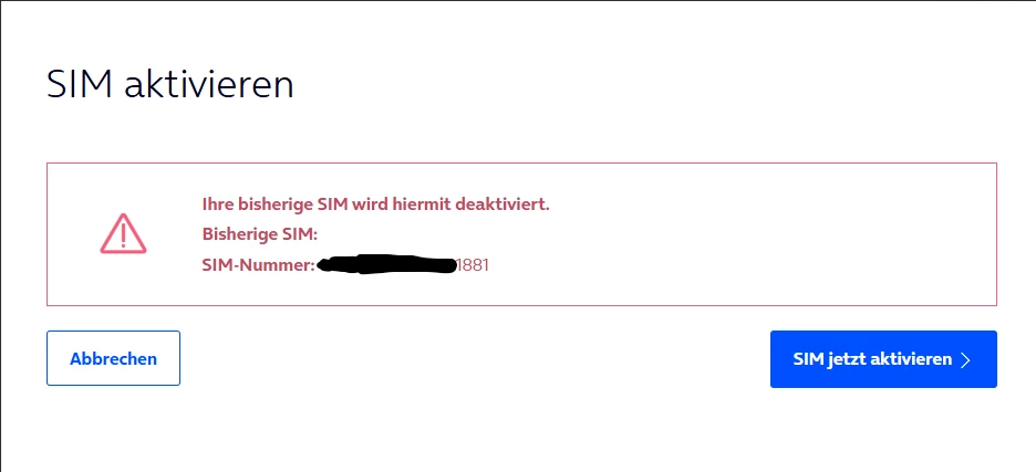 Die alte SIM xxxxxxxxxxxxxx2710 wird deaktiviert und durch die neue SIM xxxxxxxxxxxxxx1881 ersetzt, sobald ich auf weiter klicke und dann aktivieren will, kommt dieser Hinweis (siehe Anhang) und dann geht gar nichts mehr………….