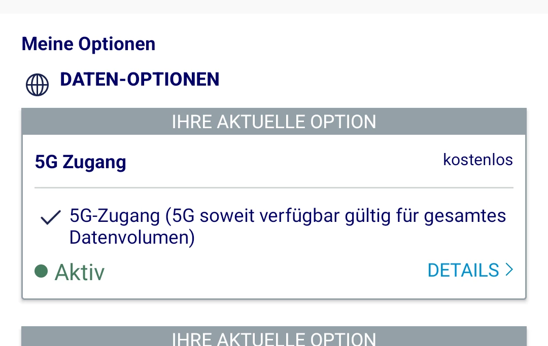 ich habe vor kurzem meinen bisherigen Vertrag bei O2 verlängert und bin nun das erste Mal in einem Tarif mit 5G Option, die lt. “Mein O2” auch aktiviert ist:
