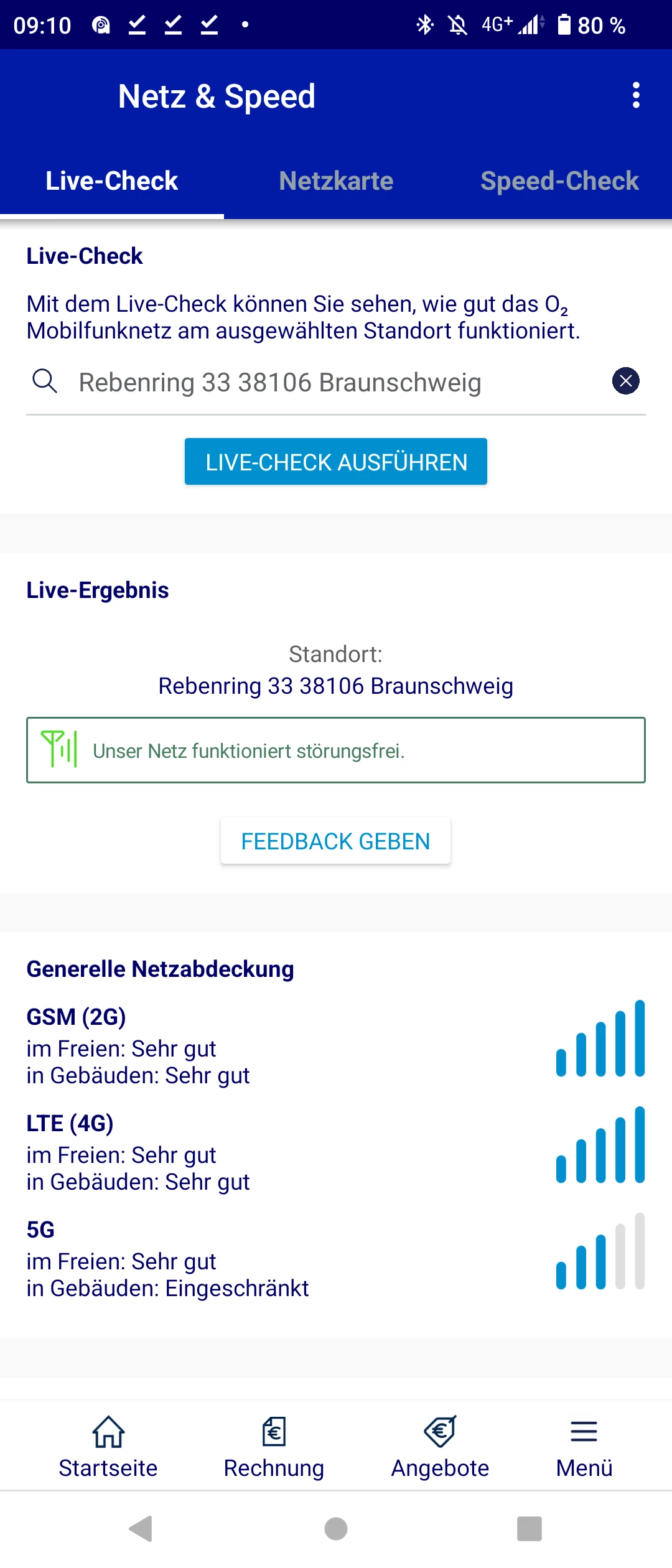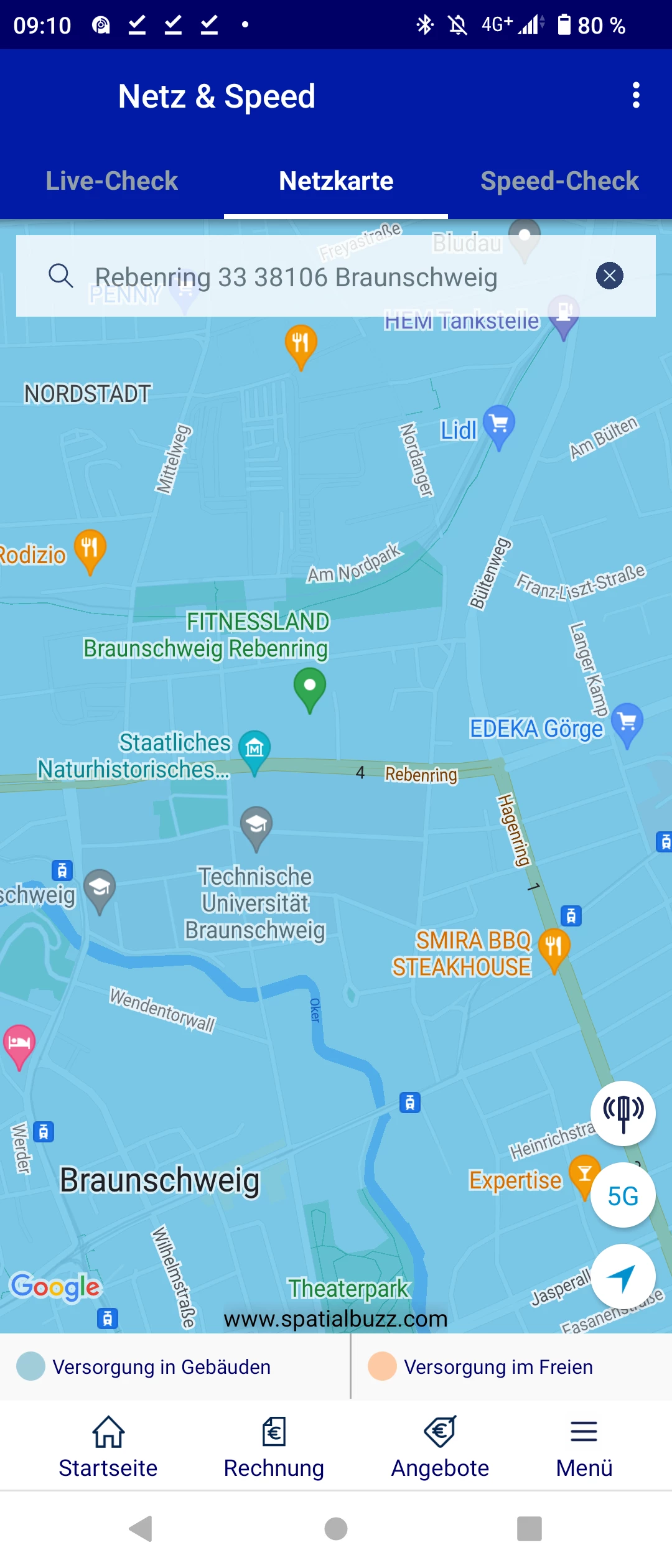 Trotzdem verbindet sich das Handy ausschließlich bzw. maximal per 4G+, auch in 5G-ausgebauten Gebieten, z. B. rund um die TU in Braunschweig (siehe unten).