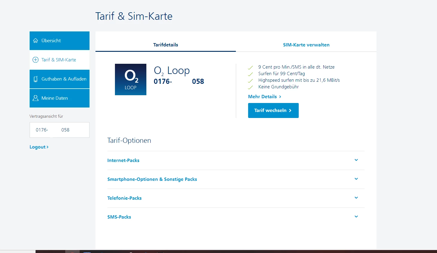 Ich habe 1 ct. guthaben, aber laut dem Mitarbeiter im store eine Telefonie und SMS-Flatrate mit drin, so wie 3,5 GB. o2 Loop wird als tarif angezeigt. Diese hat im o2 Shop 10 Euro Gekostet.