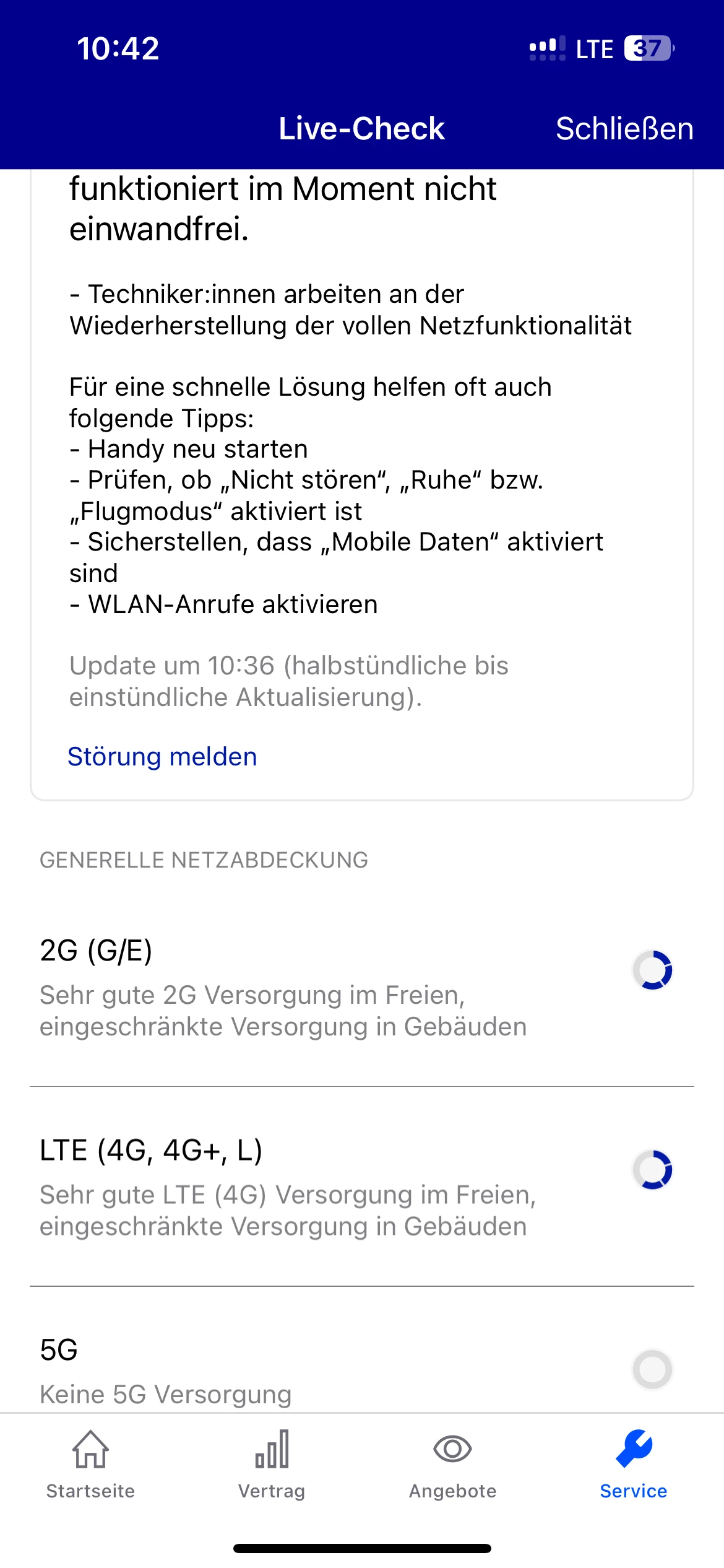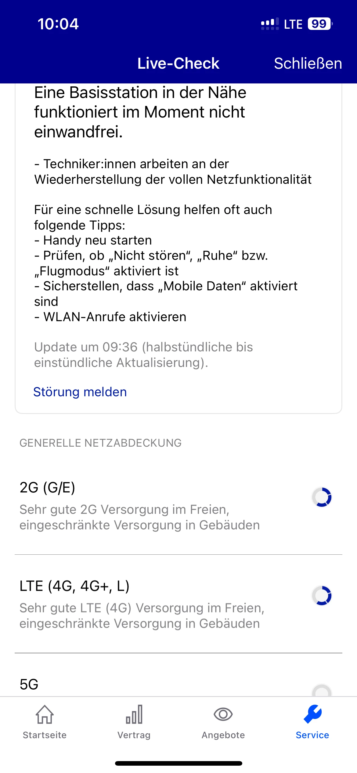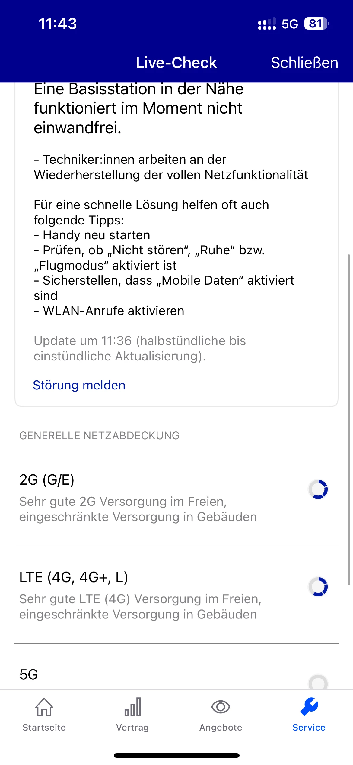 Dein Problem immer wieder hier zu posten wird die Situation nicht verbessern. An deinem Standort liegt aktuell eine Störung vor, aber auch so ist, wie du selbst gesehen hast, die Netzabdeckung in Gebäuden nicht gut. 5G ist gar nicht vorhanden.