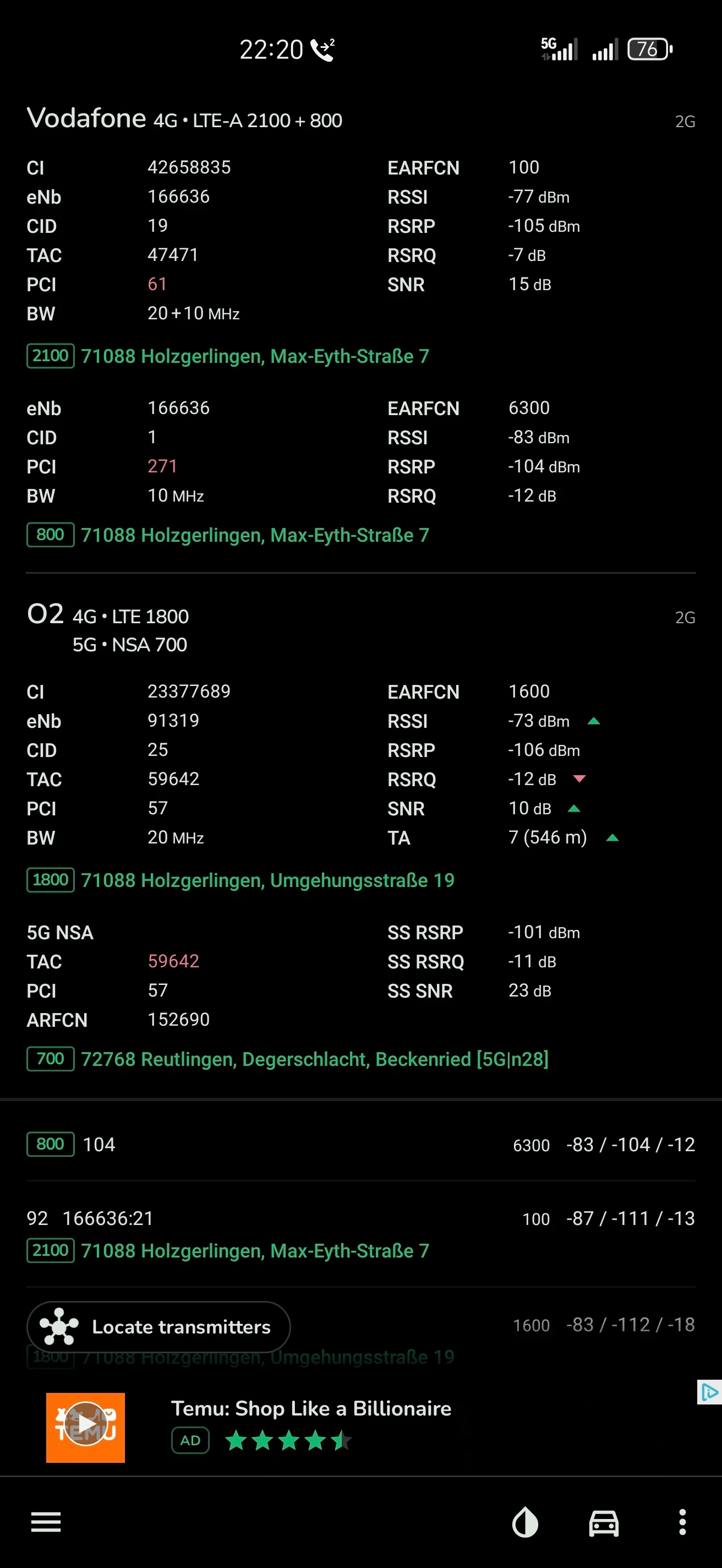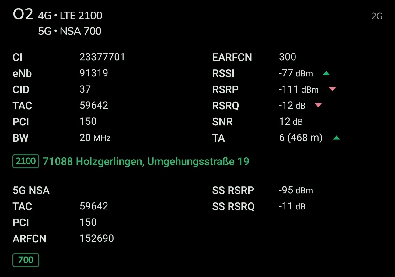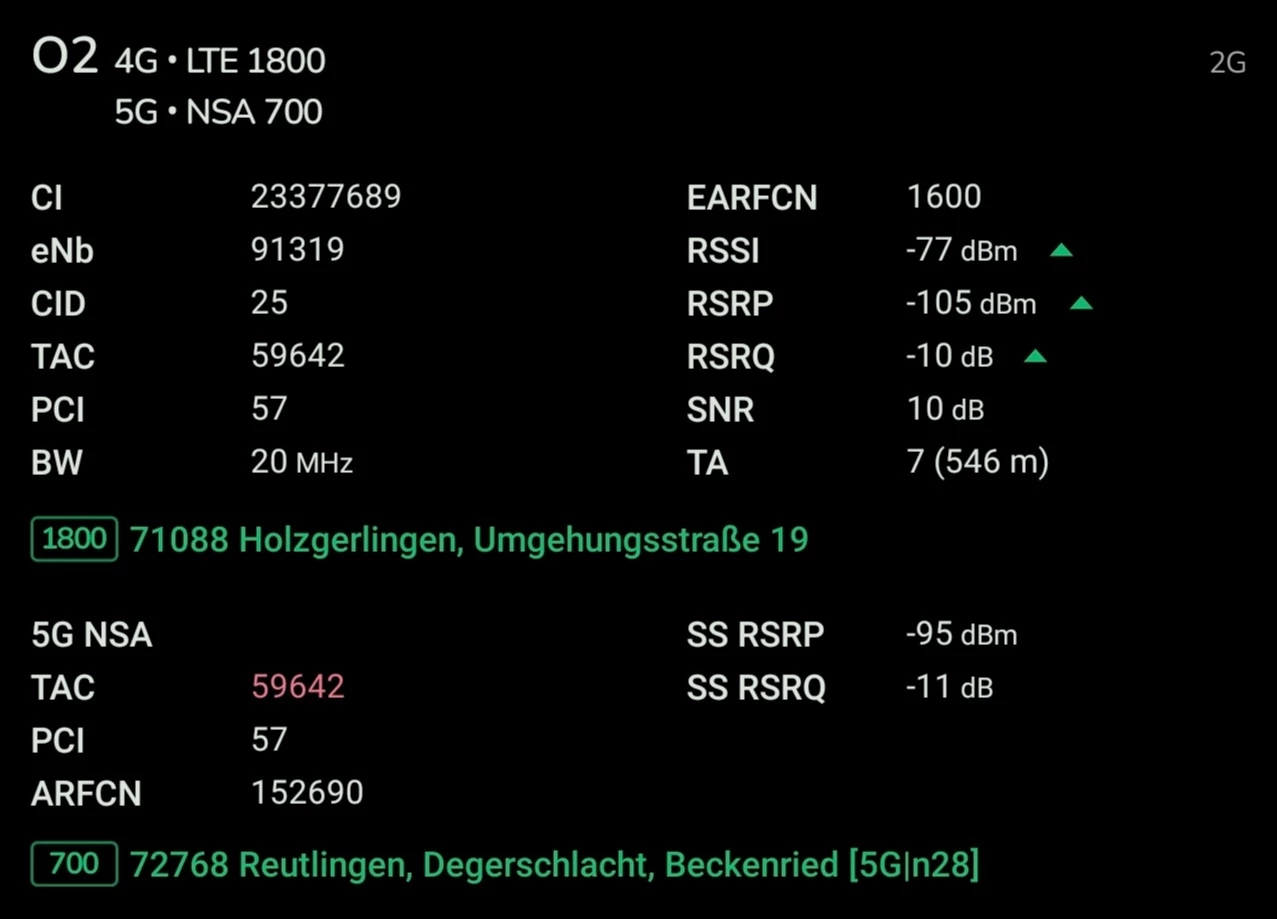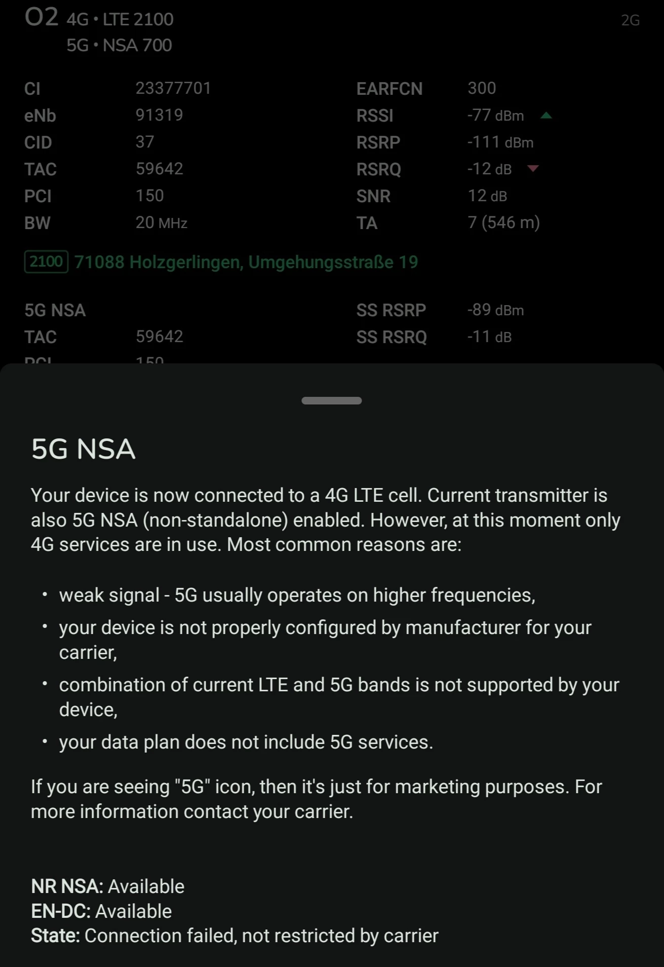 Die Station “Pfarrer-Martin-Thust-Weg 71088 Holzgerlingen” verfügt über noch keinen 5G Ausbau. Mit Glück kann das 5G 700 von der Station “Max-Eyth-Straße 24” zusätzlich zum LTE von der anderen Station genutzt werden. Für mich sieht das ein wenig nach falschen Daten aus.