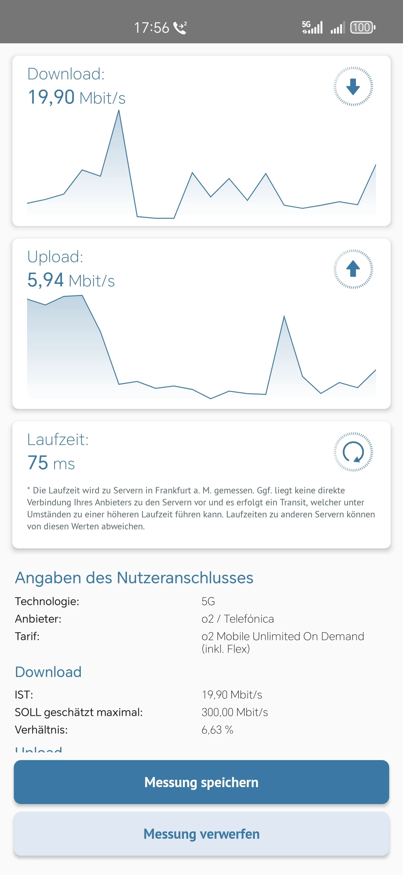 Heute morgen hatte ich bei 5G 102Mbit down und 30Mbit up. Das wäre akzeptabel, wenn es am Tag gleich oder besser sein würde.