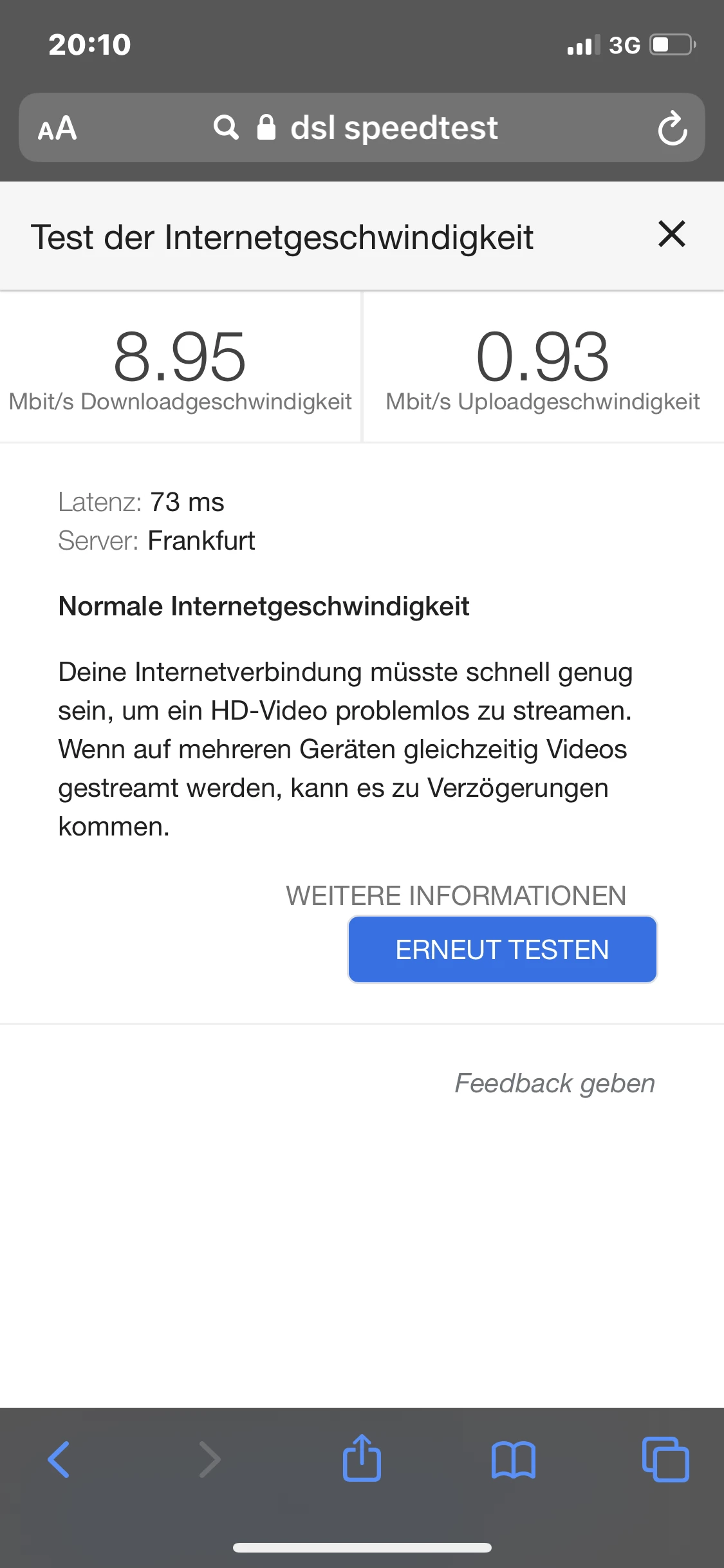 Hier ein paar speed Test mit lte nd 3g. Ich benutze zurzeit nur noch 3 g da es doch etwas schneller geht.