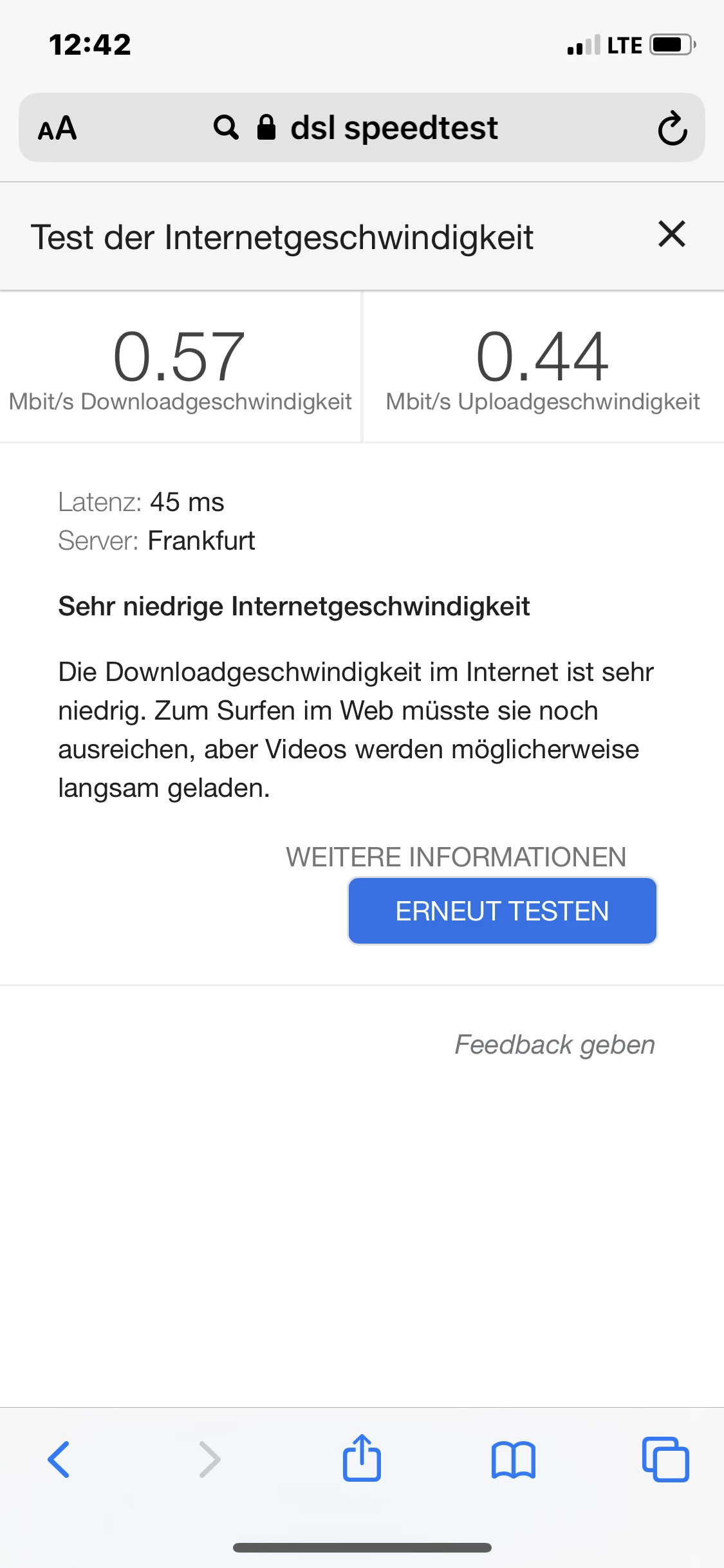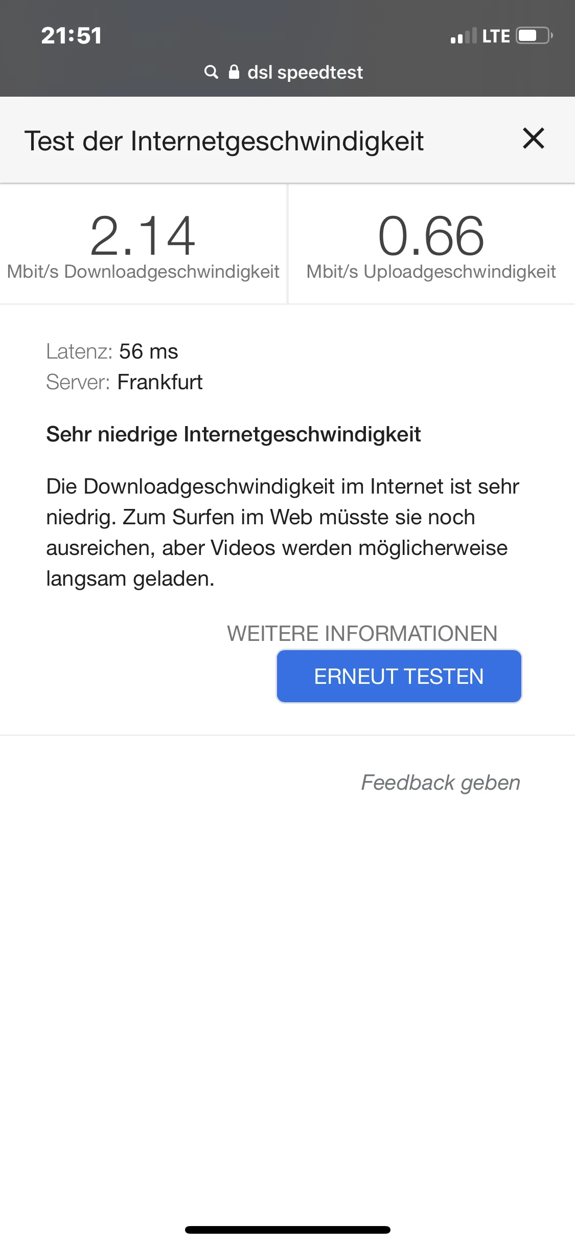 Ich denke es kann hier in diesen Bereich helfen, mal testweise das LTE im Smartphone zu deaktivieren. Es könnte sein, dass du im UMTS Netz deutlich höhere Geschwindigkeiten erreichst.