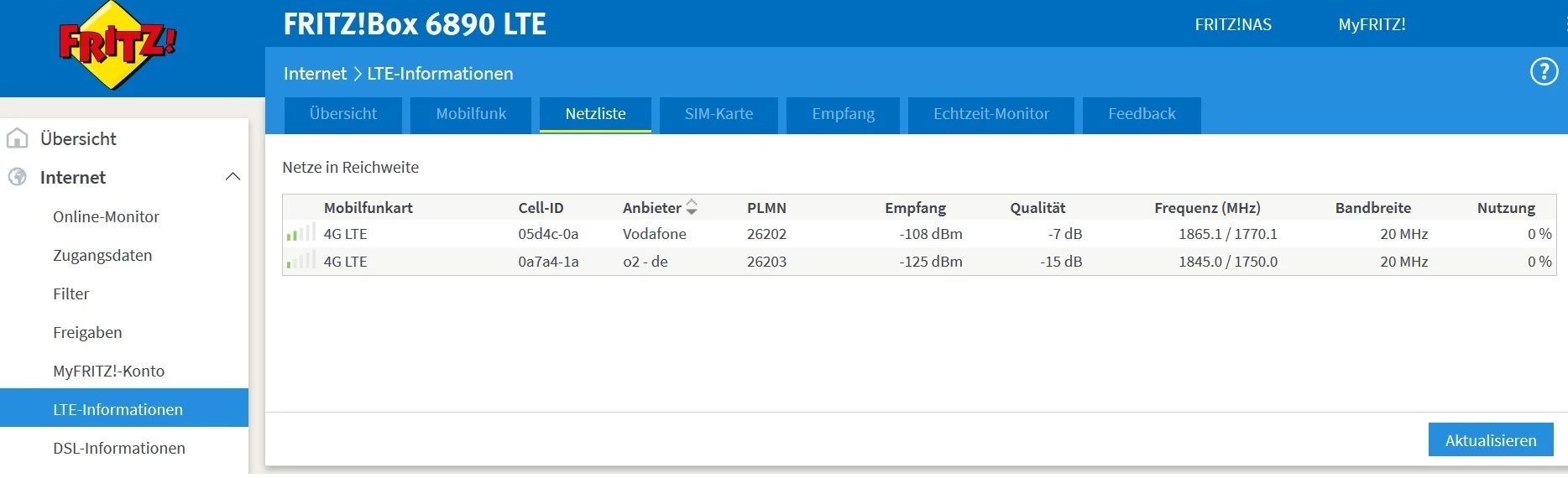 Wenn ich die FritzBox auf LTE-800 stelle, verbindet sie sich übrigens mit sehr ähnlichen Werten.