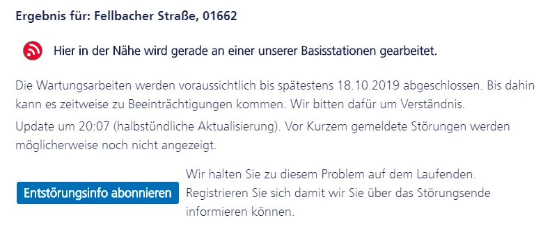 Dort kannst du auch die Entstörungsinfo abonnieren. So bekommst du auch eine Info, wenn die Arbeiten abgeschlossen sind.