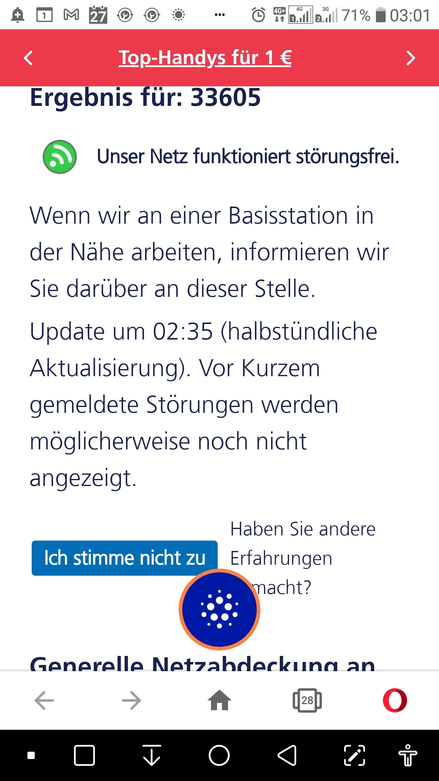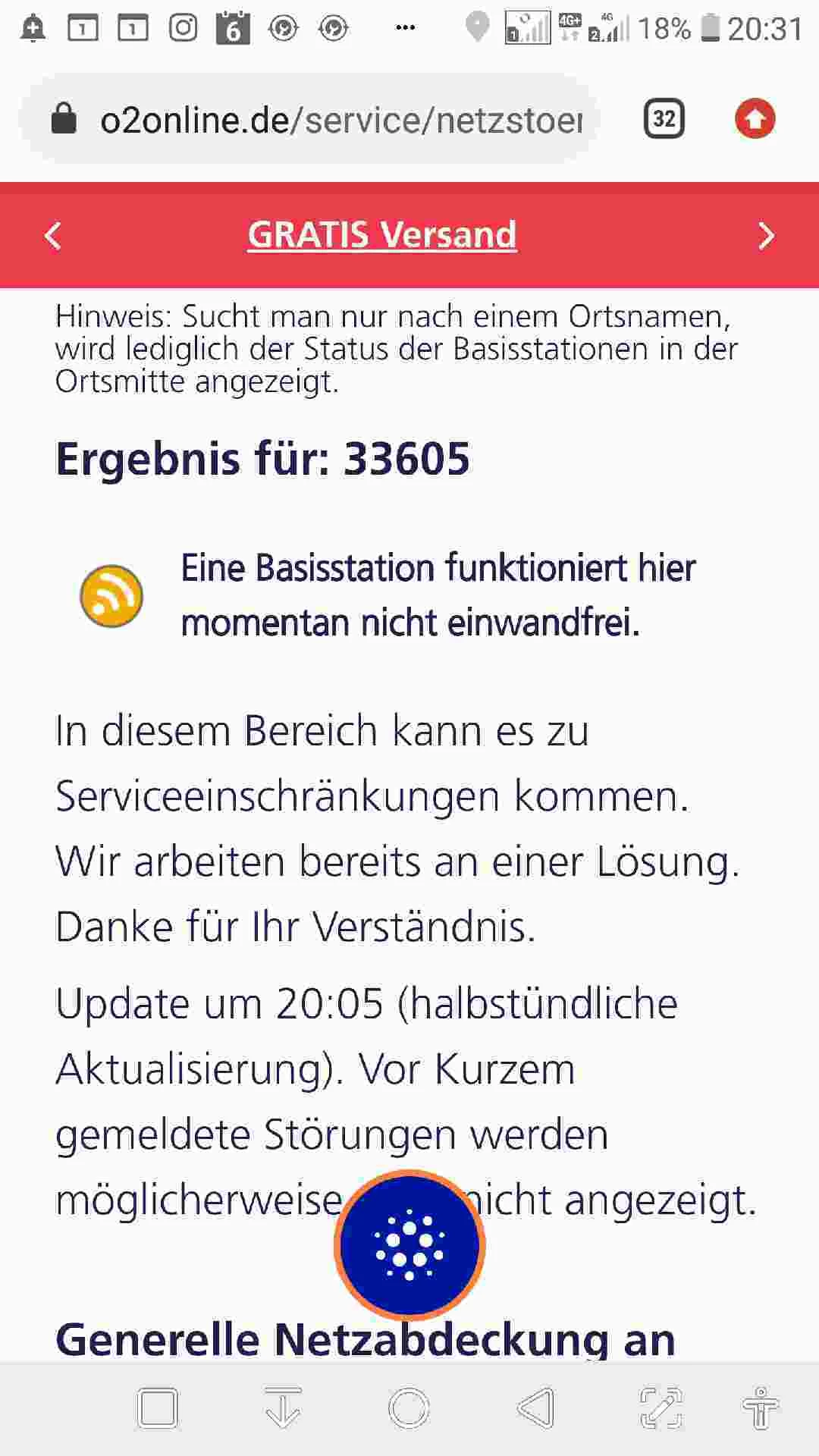 Das O²-Netz / die Mobilfunk-Basisstation für die Region Bielefeld / Herford etc. ist schon seit ca. 40 Tagen defekt / gestört.