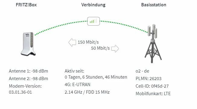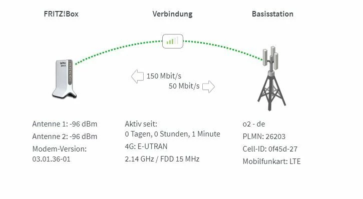 Der RSRP könnte schon etwas besser sein. Also was man hier machen könnte, wäre die Fritzbox an ein Fenster zu stellen, welches am besten in Richtung des Sportplatzes zeigt -  und gut wäre ein Platz möglichst hoch im Gebäude.