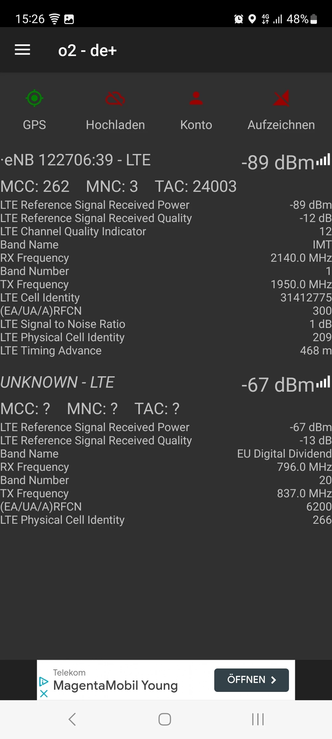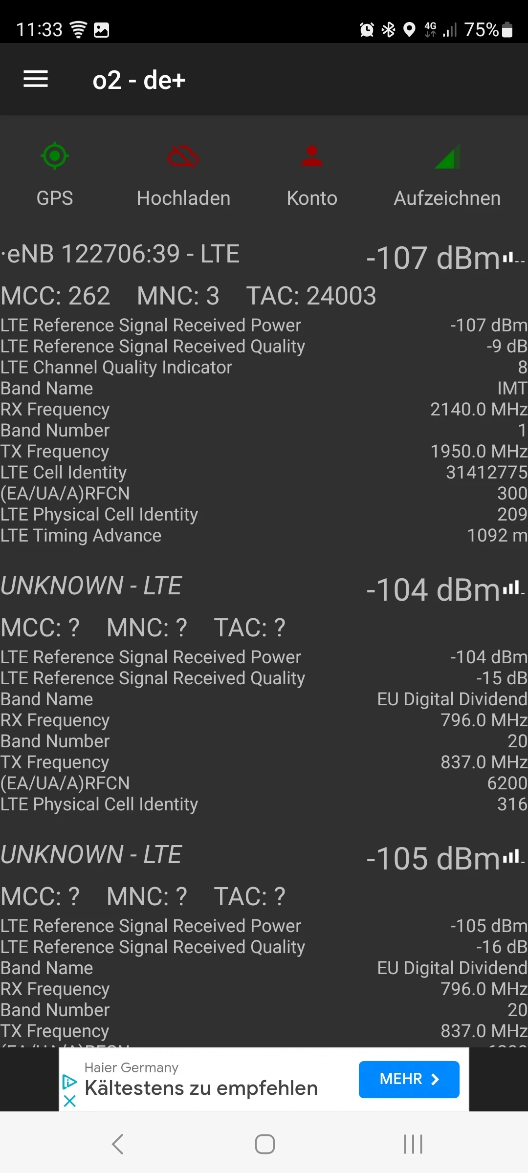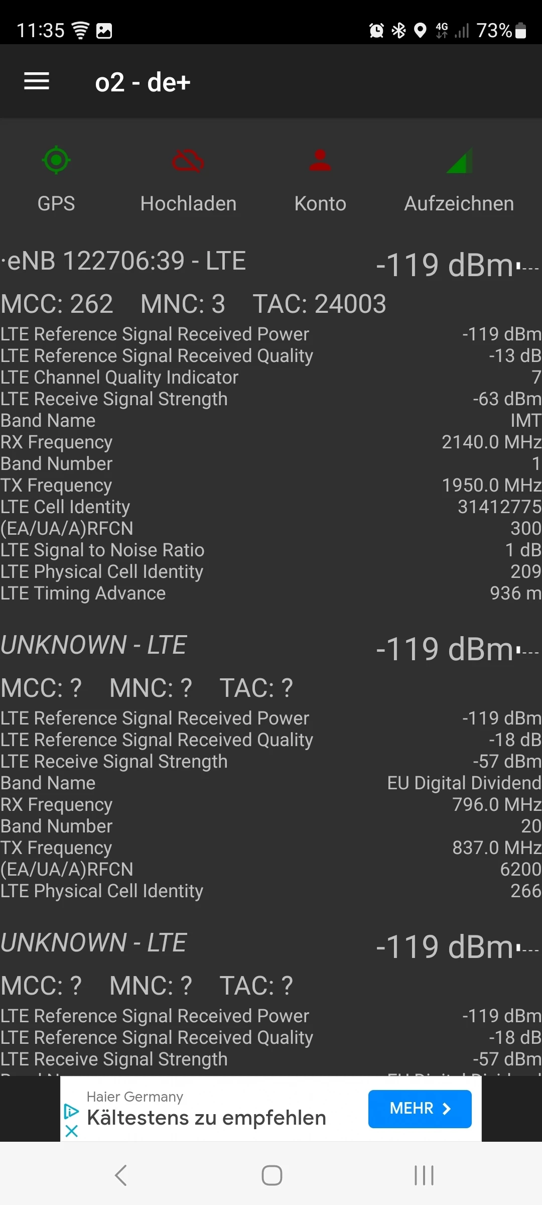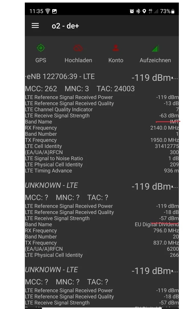 Auf den Screenshots (vom Balkon aus), sieht man auch die Werte für LTE 800, und scheinbar ist der Empfangspegel leider vergleichbar, mit dem Pegel vom LTE 2100.