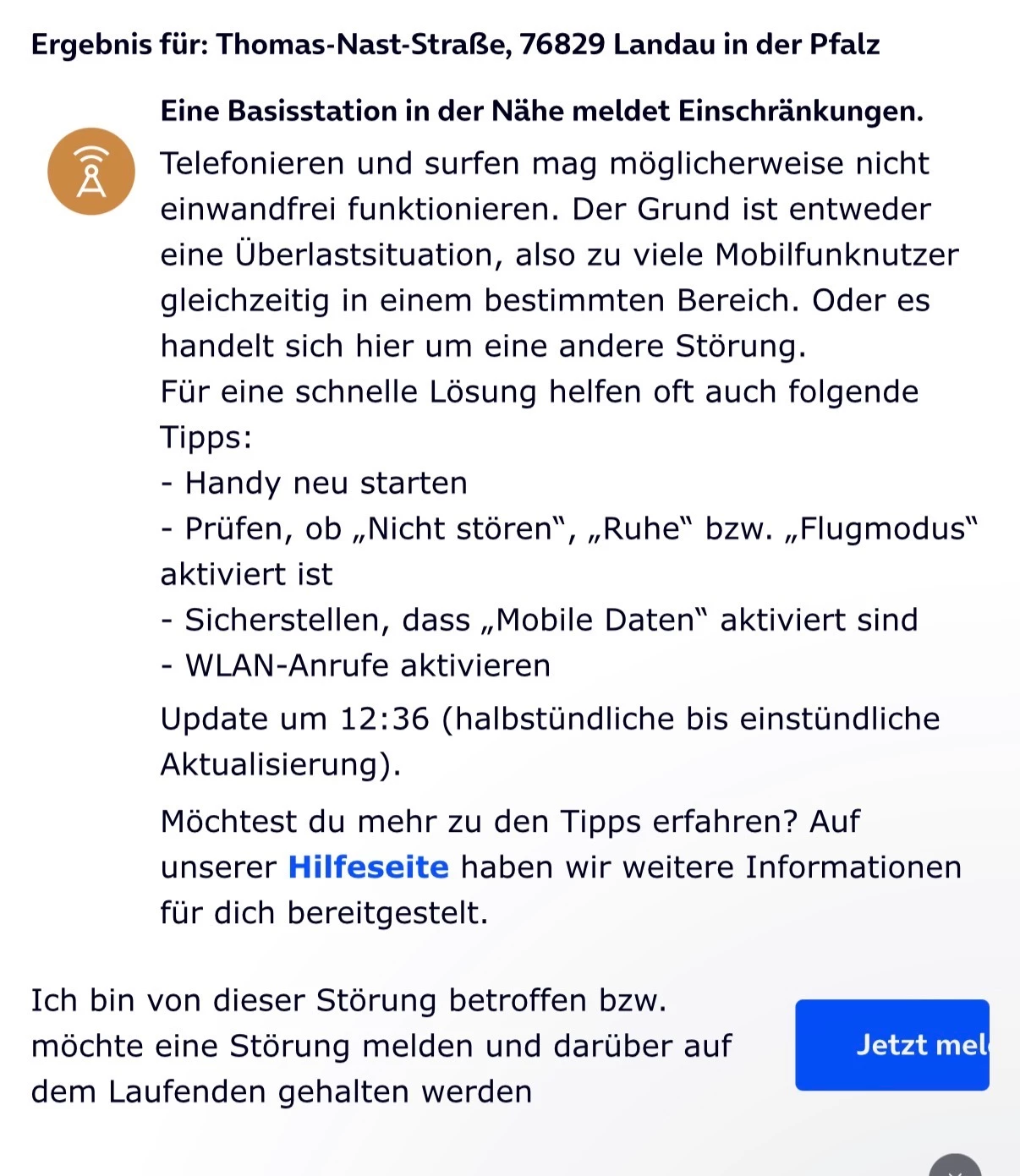 in meiner Straße (76829 Landau in der Pfalz, Thomas-Nast-Straße) meldet eine Basisstation mittlerweile seit mehreren Wochen Einschränkungen, dies betrifft in erster Linie das Internet.  Dann funktioniert es mal ein paar Tage vernünftig, um anschließend wieder im einstelligen MB-Bereich rumzudümpeln.