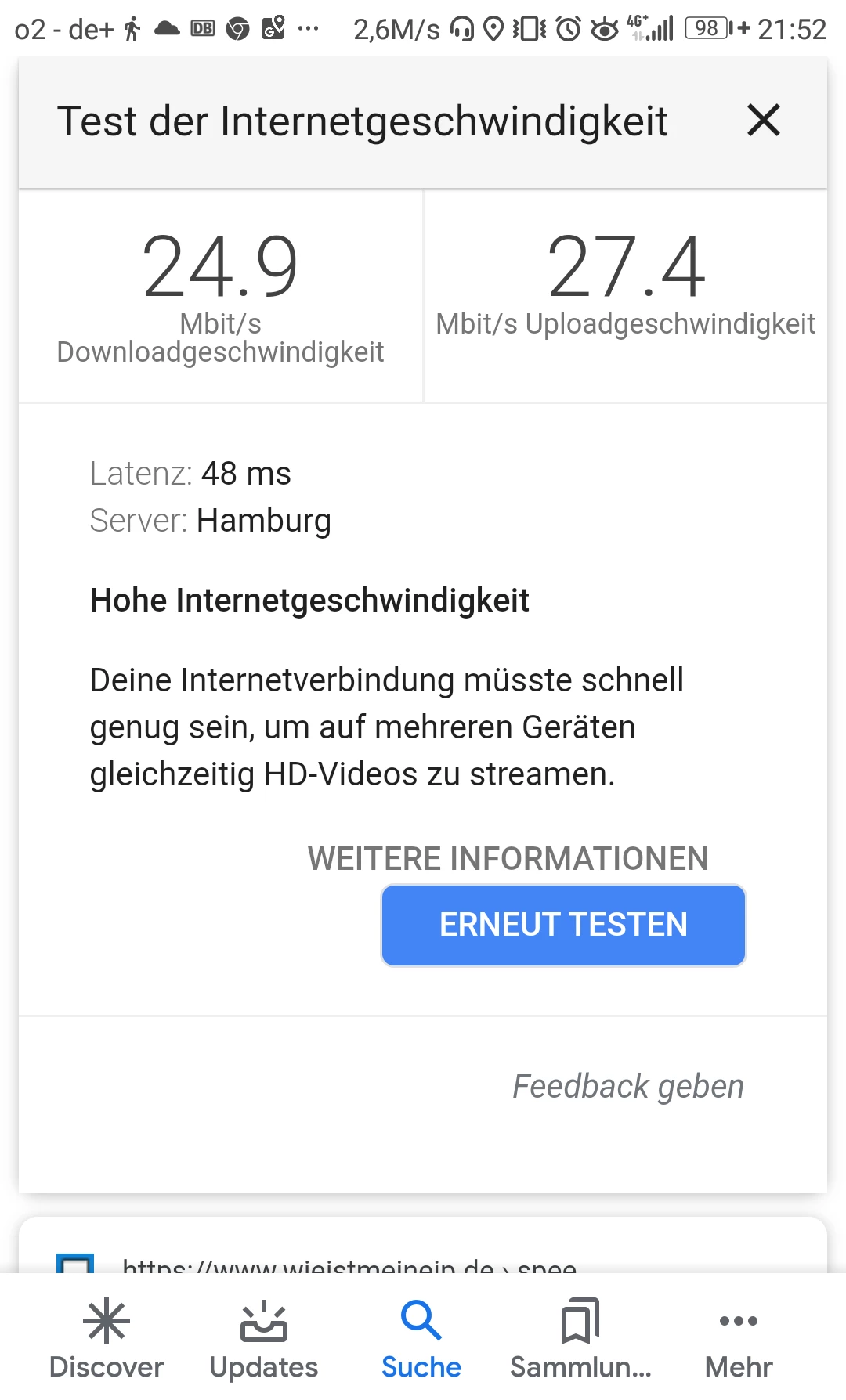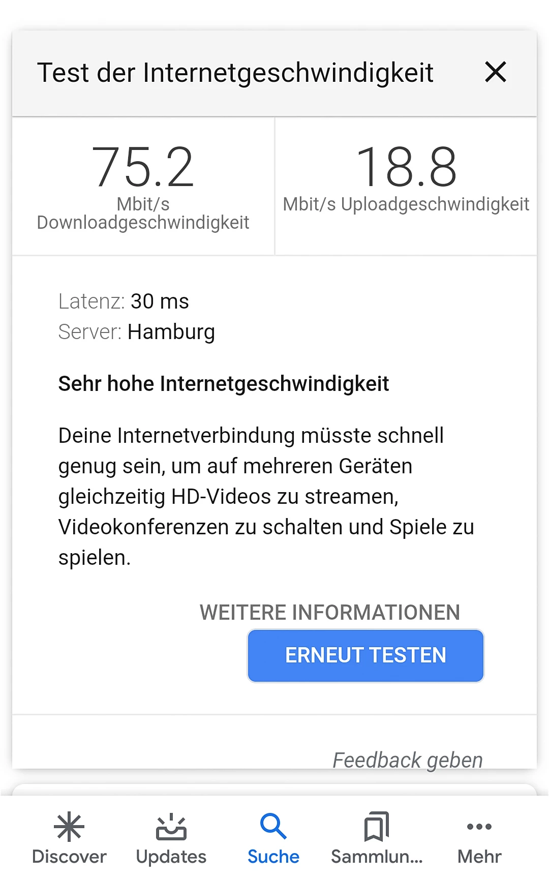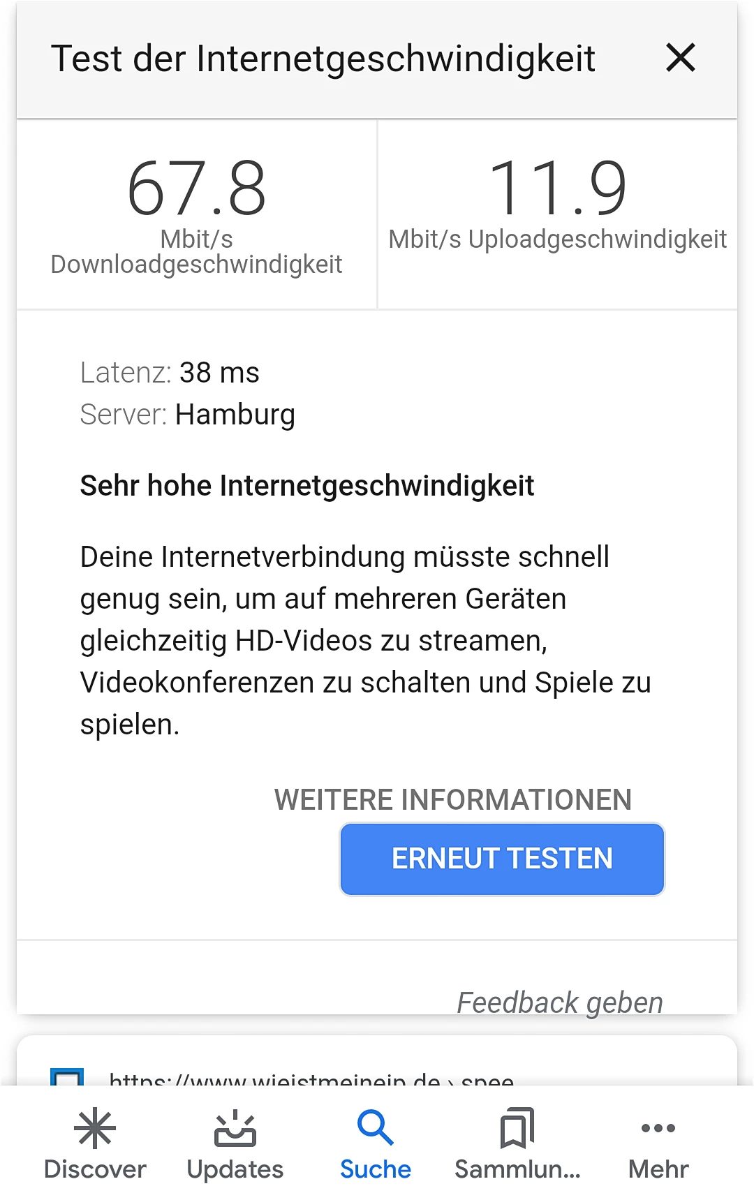 Anbei zwei Google-Speedtests von gestern (Neuenlander Str. 300, 28201 Bremen, Download 75,2 mbit/s) und heute (Bahnhof Hamburg-Altona, 22765 Hamburg, Indoor, Download 67,8 mbit/s).
