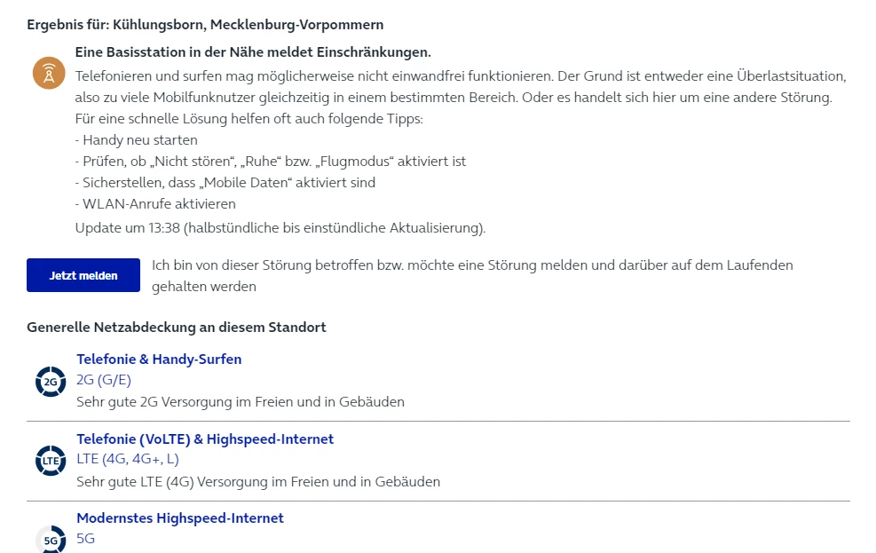 ich entschuldige mich für unsere späte Antwort. In unserem Live-Check wird für 18225 Kühlungsborn Einschränkungen unseres Netzes angezeigt, was auf eine Überlastsituation zurückzuführen sein kann: