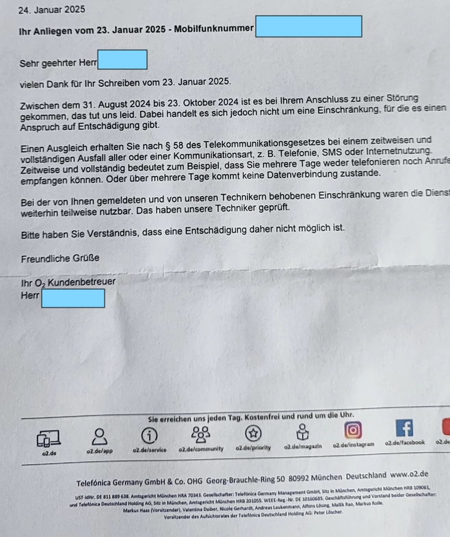 Ich rate dir, sobald die Störung behoben ist, aufgrund der aktuell laufenden Störungstickets dann noch einmal einen Antrag auf Entschädigung zu stellen. Denn meine Anfrage mit der Antwort, dass eine Station abgebaut werden musste - dies kann auch etwa an einem ausgelaufenen Mietvertrag liegen - deutet nicht auf eine teilweise Störung hin, und du berichtest ja auch von einer vollständigen Störung.