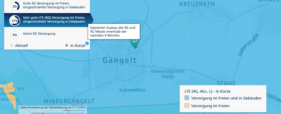 Unser Netz erfuhr einen Ausbau einer bestehenden Station ab dem 11.12., jedoch für einmal unser 5G Netz, welches deine Adresse nicht versorgt, zum anderen für unser 4G/LTE Netz., welches an deiner Adresse im Freien, nicht jedoch innerhalb von Gebäuden ausreichend ist.