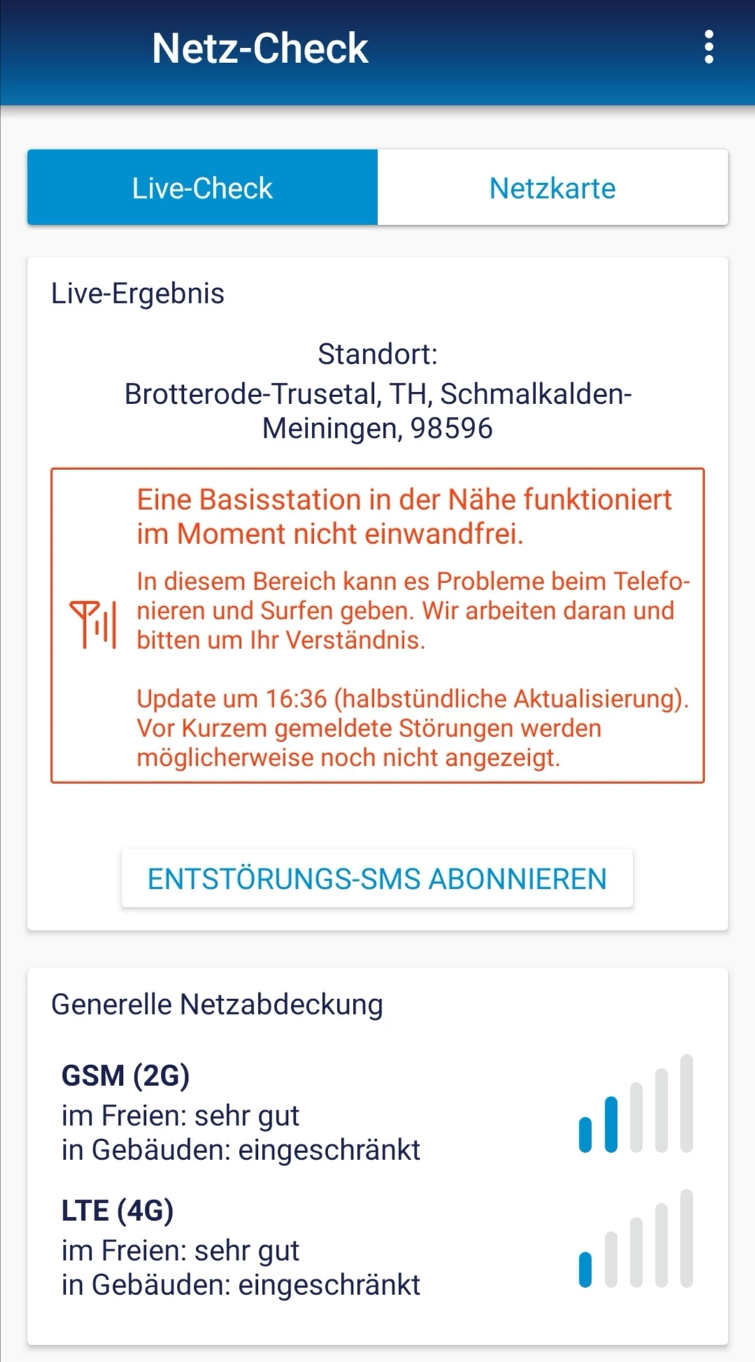 Soweit ich das richtig sehe, betrifft es die Station an der Skisprungschanze. Um möglichst genaue Ergebnisse zu erhalten, kann es helfen im Livecheck nicht nur die Postleitzahl, sondern einen vollständige Adresse einzutippen. :wink: