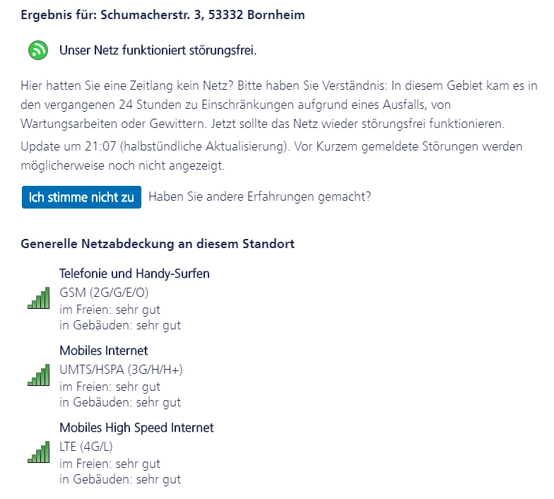 Gern habe ich einmal nachgeschaut, was an der Adresse Schumacherstr. 3 in 53332 Bornheim los ist. Mir wird angezeigt, dass es dort seit heute eine Einschränkung einer Basisstation gibt, die das LTE 1800 Frequenzband versorgt. Die anderen Stationen, die das LTE Frequenzband 800, sowie 3G und 2G dort versorgen funktionieren inzwischen einwandfrei.