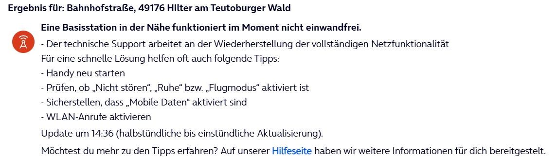 Hallo, seit 2 tagen habe ich bei der Firma in Hilter KEIN Netz ,nicht einmal Tel. Geht .und nein es liegt nicht an meinen Handy da andere Kollegen das gleiche Problem haben, seit dem 16.4 direkt morgens um 7 Uhr kein Netz mehr   49176 Hilter atw. Bahnhofstraße