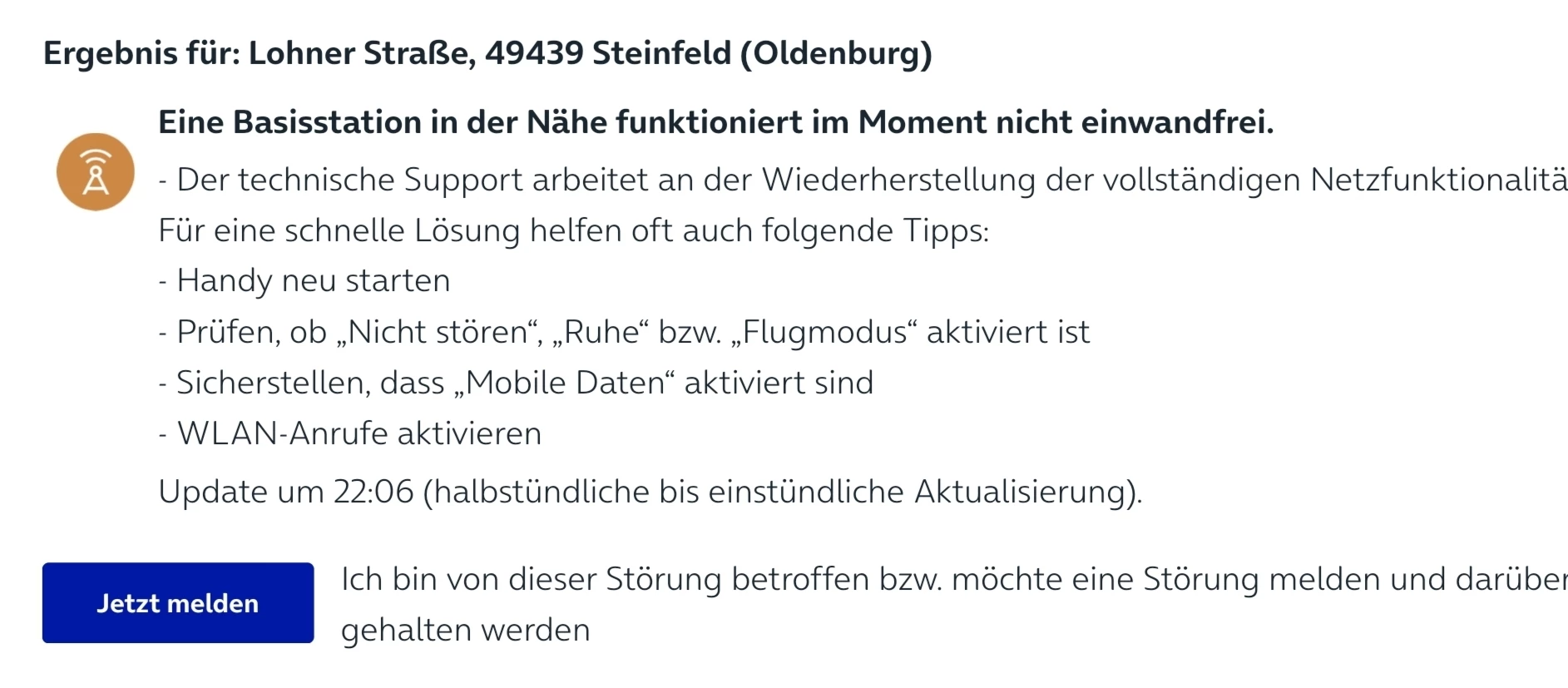 Ich habe, über den Telefonservice und in der o2-App, bereits eine Störung für diese Adresse gemeldet. Im Live-Check wird auch eine Störung an einer Basisstation angezeigt.