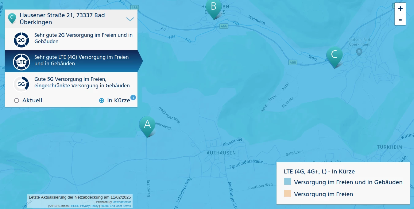 Allgemein bauen wir weiter aus und optimieren die Abdeckung permanent. Die Datennutzung zieht ja auch immer noch weiter an. 18 Uhr, Feierabend, Streaming oder am PC sitzen...da kommt schon etwas zusammen an Bandbreite. Momentan bauen wir Richtung Aichelberg und Plochingen aus - zumindest geplant. Ist aber nur die Momentaufnahme.
