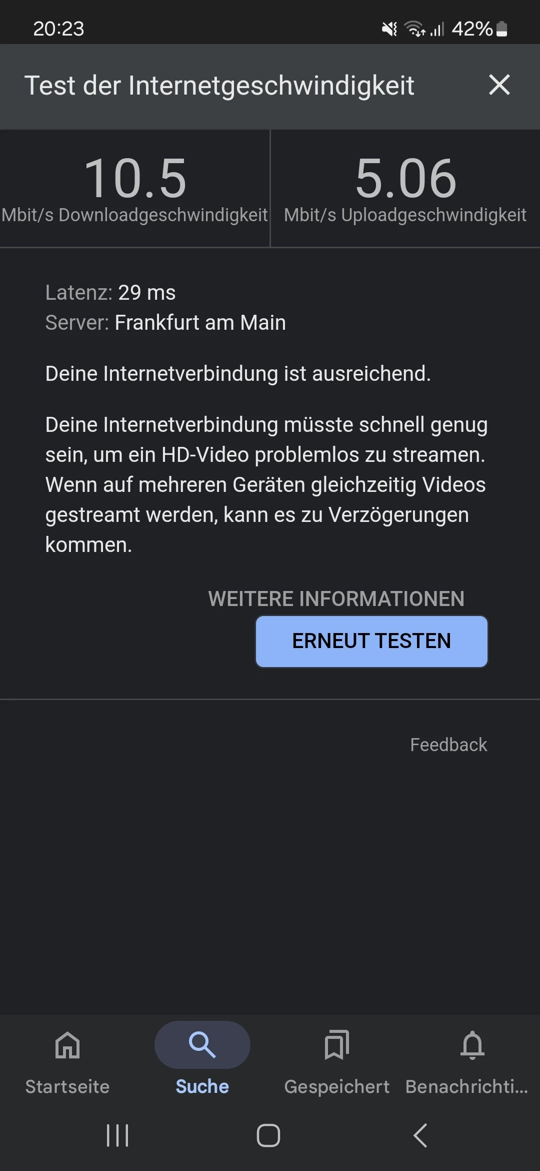 Die Geschwindigkeit ist momentan auch wieder gering. 15mbits download 47mbits upload.
