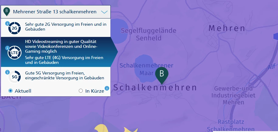 Auch für die dritte Adresse ist zumindest in der nahen Zukunft kein Ausbau von 5G angezeigt, 4G jedoch als verfügbar angezeigt.