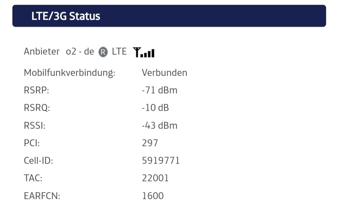 Die RSRP-, RSRQ- und RSSI-Werte befinden sich im Durchschnitt nur 5 dB - 20 dB vom bestmöglichen Richtwert entfernt und mein Router steht am Fenster mit freier Sicht auf die LTE-1600 Zelle vom gegenüberliegenden Dach.