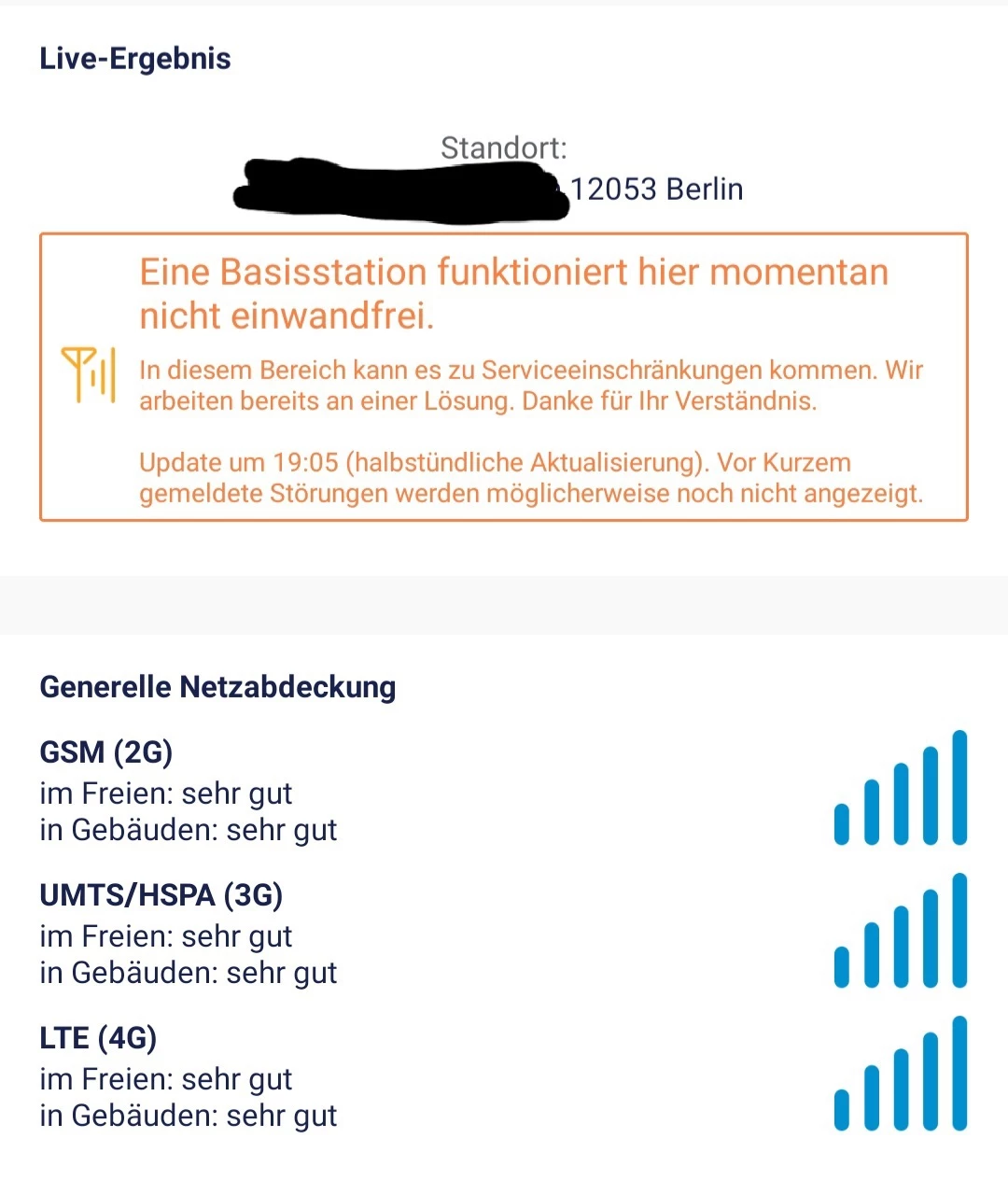 Jetzt kommt es dazu, dass seit ca. einer Woche eine Basisstation in meiner Nähe eine Störung meldet und auf Nachfrage im o2-Shop, der sich nicht unweit von mir befindet, soll am morgigen Sonntag (24.01.2021) die Störung behoben werden.