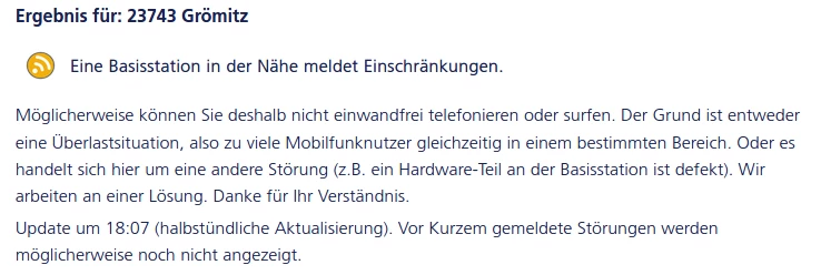 Telefonieren und surfen mag möglicherweise nicht einwandfrei funktionieren. Der Grund ist entweder eine Überlastsituation, also zu viele Mobilfunknutzer gleichzeitig in einem bestimmten Bereich. Oder es handelt sich hier um eine andere Störung (z.B. ein Hardware-Teil an der Basisstation ist defekt). Wir arbeiten bereits an einer Lösung und bitten um Verständnis.
