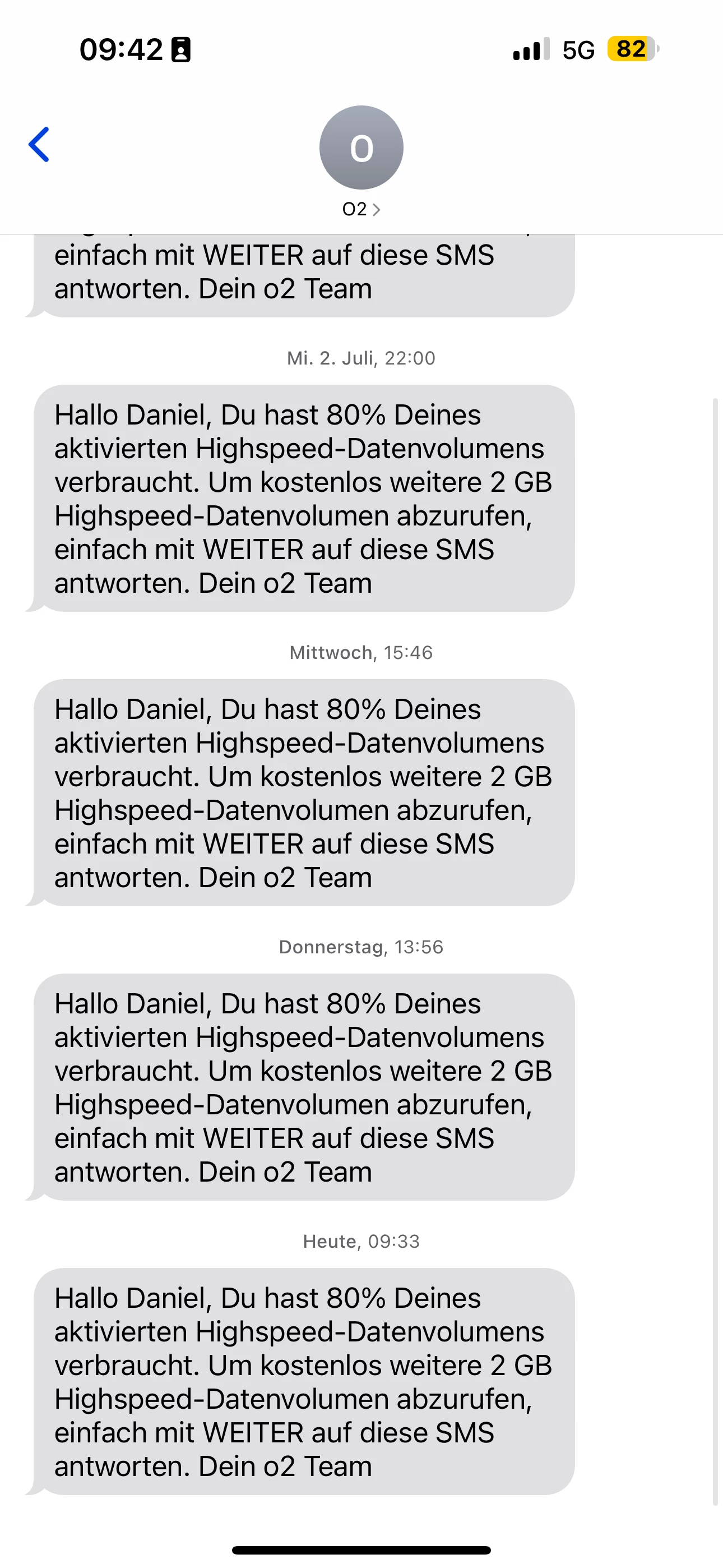ich nutze ein i Phone 15 Plus und habe den O2 Unlimeted on demad online. Um die 2gb weiteres Datenvolumen zu bekommen, muss man bei diesen auf die sms von o2 antworten. Leider kann ich auf die sms nicht antworten, weil sich einfach keine Tastatur oder Festgeld zum Antworten öffnet. Daraufhin hat o2 ein Ticket  aufgenommen und der Netzservice hat mir dann eine sms gesendet, dass Sie keine Beeinträchtigung Ihres Nettes feststellen konnten. Ich habe aber weiterhin dieses Problem. Könnte mir da bitte jemand weiterhelfen ?