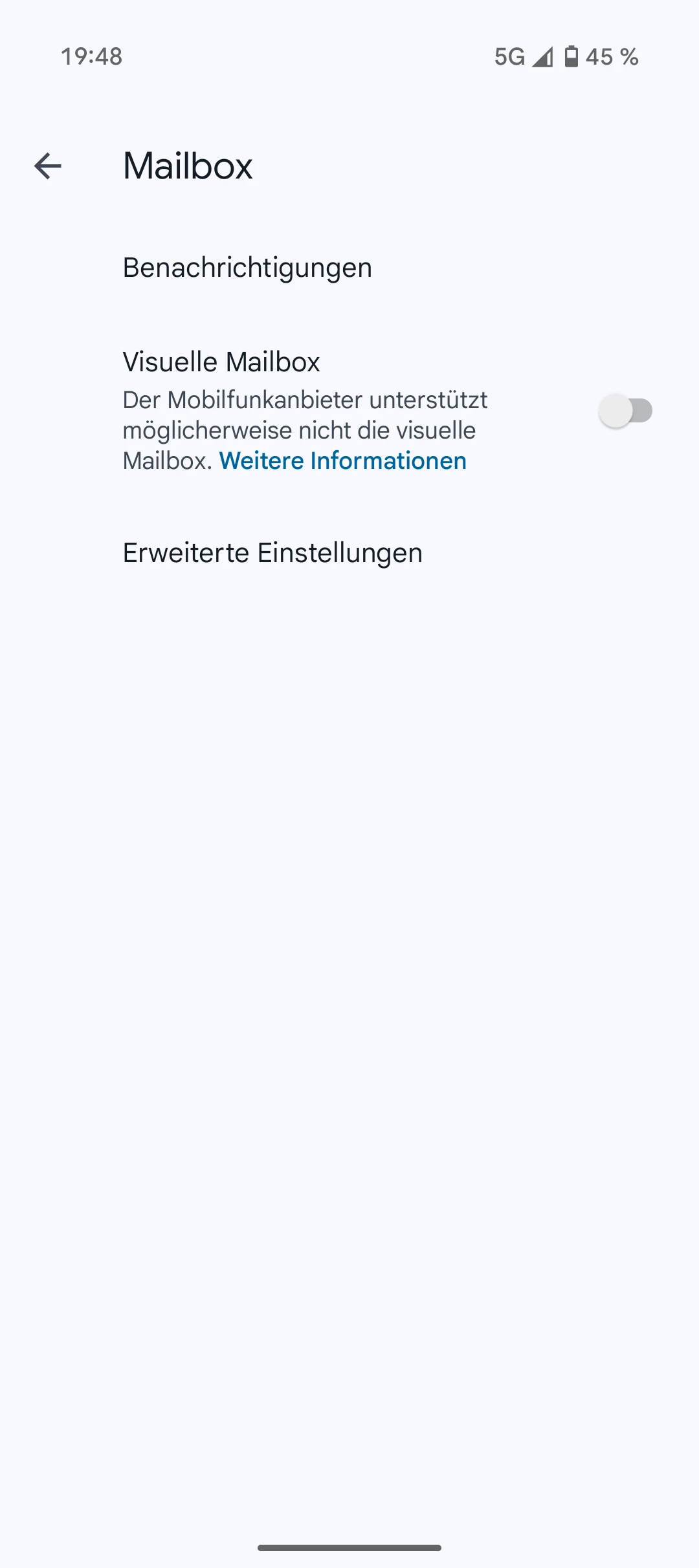 ich habe alles Genannte versucht aber der Schalter legt sich nicht um. Ich habe die Vermutung, dass es nur in der O2 Voicemail App geht und nicht in der Google Telefon App.