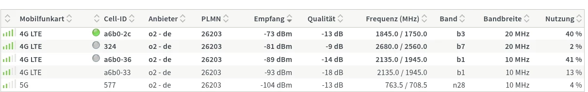 Zumindest wurde wohl das 1,8 GHz hier abgeschaltet? Dafür 2,6 GHz aktiviert gestern, heute findet die FB nur noch 800 MHz und 2135 MHz. Aber so wie es aussieht, sind die Tower (Kunde->Zelle) nicht so überlastet (nur gut ausgelastet).