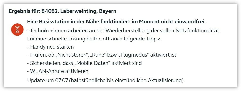 Der Live Check sagt dies auch aus: Eine Basisstation in der Nähe funktioniert im Moment nicht einwandfrei.
