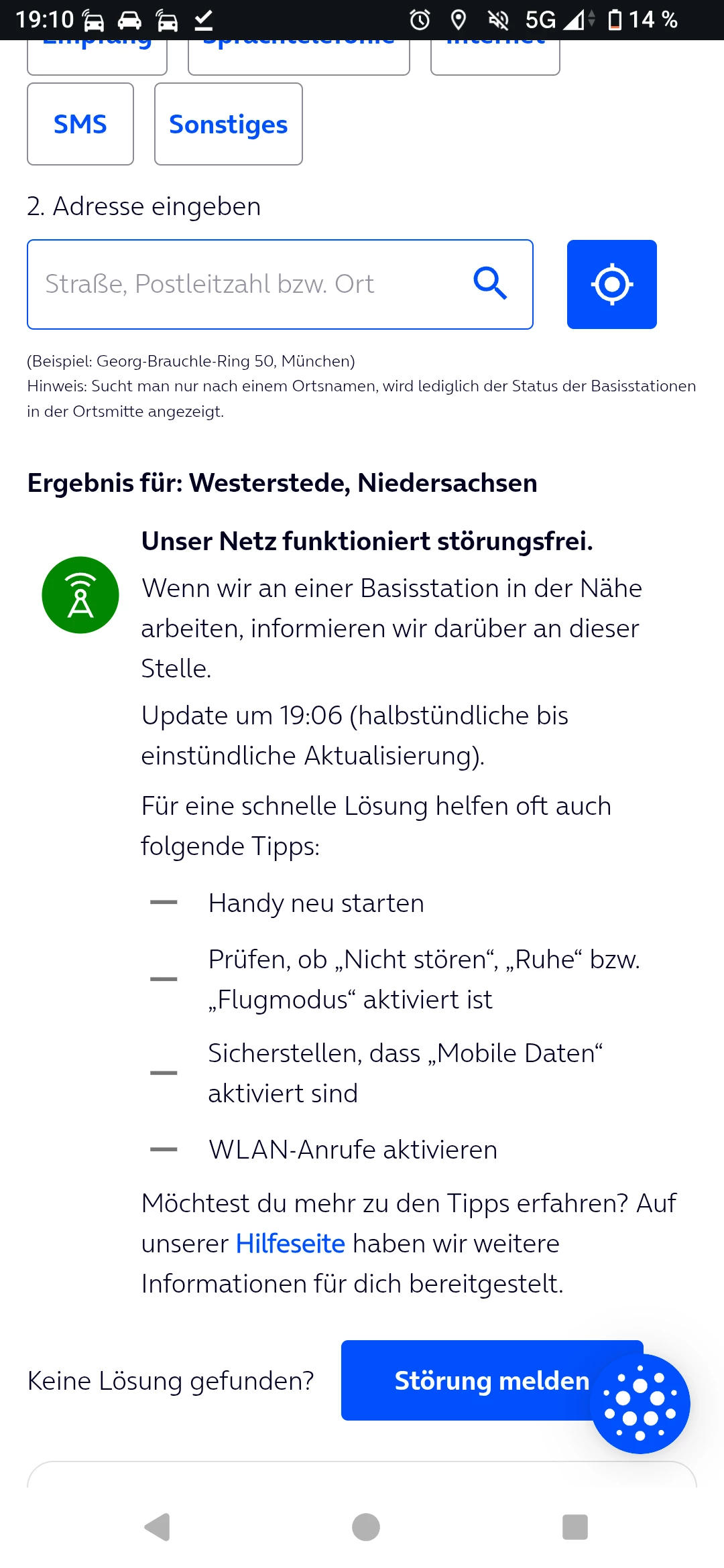 Übrigens Euer Netz in 26655 Westerstede. Draußen auf einem Sonntag bei sehr gutem Empfang. Varel ist auch eine absolute Katastrophe. Aber gut, das Thema hatten wir ja schon.