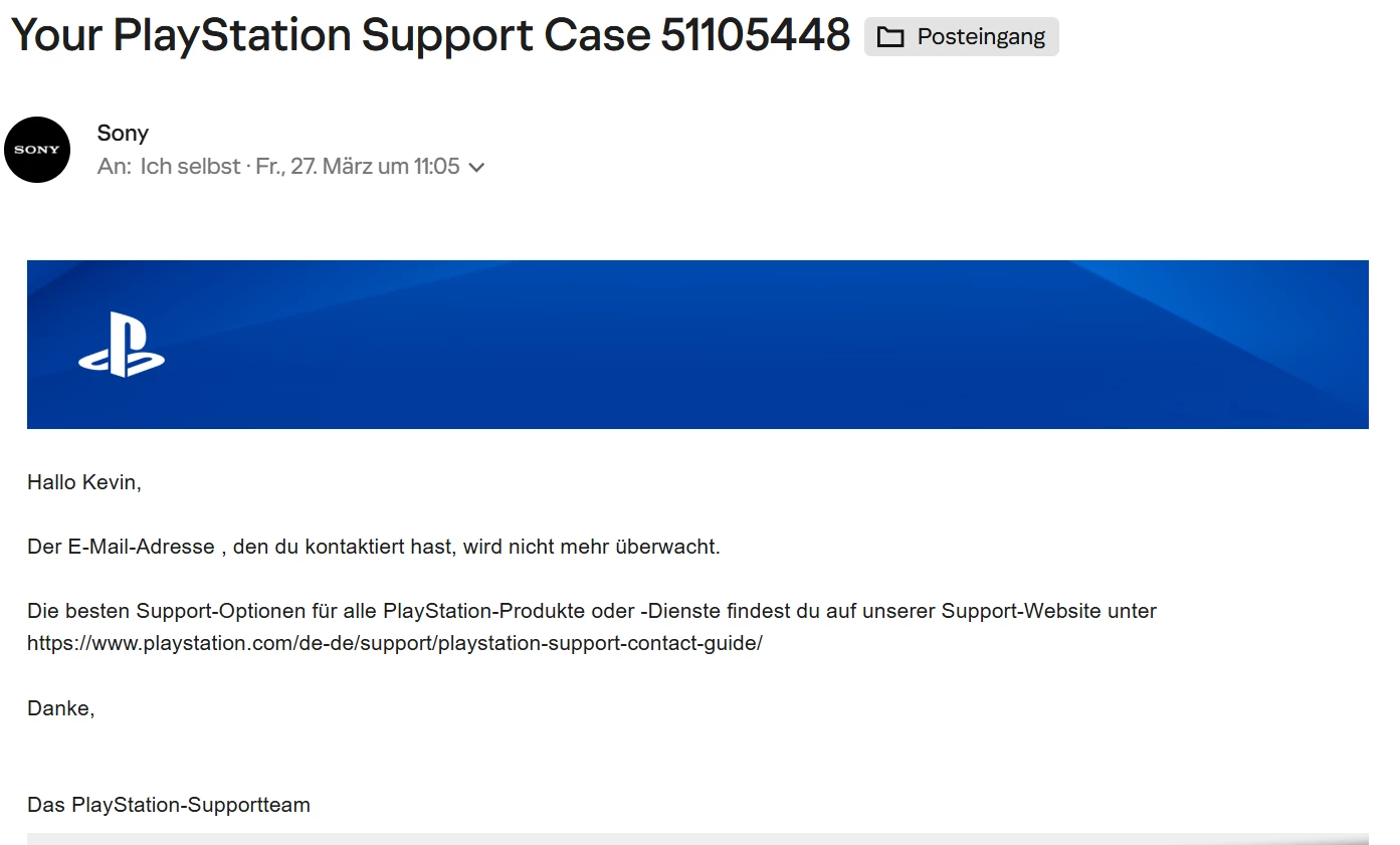 Wo genau soll ich mich denn bitte hin wenden? Ich habe jetzt eine E-Mail an service@de.playstation.com geschrieben. Ich kenne es aber so, dass von Seiten des PlayStation Supports keinerlei Rückmeldung erfolgt. Ich hatte damals das Problem das ein Playstation Accout aufgrund des Zusammenführen eines Sony Accounts mit dem PlayStation Accounts, dazu führte dass meine ganzen Spiele verloren gingen. Da gabs auch keine Rückmeldung.
