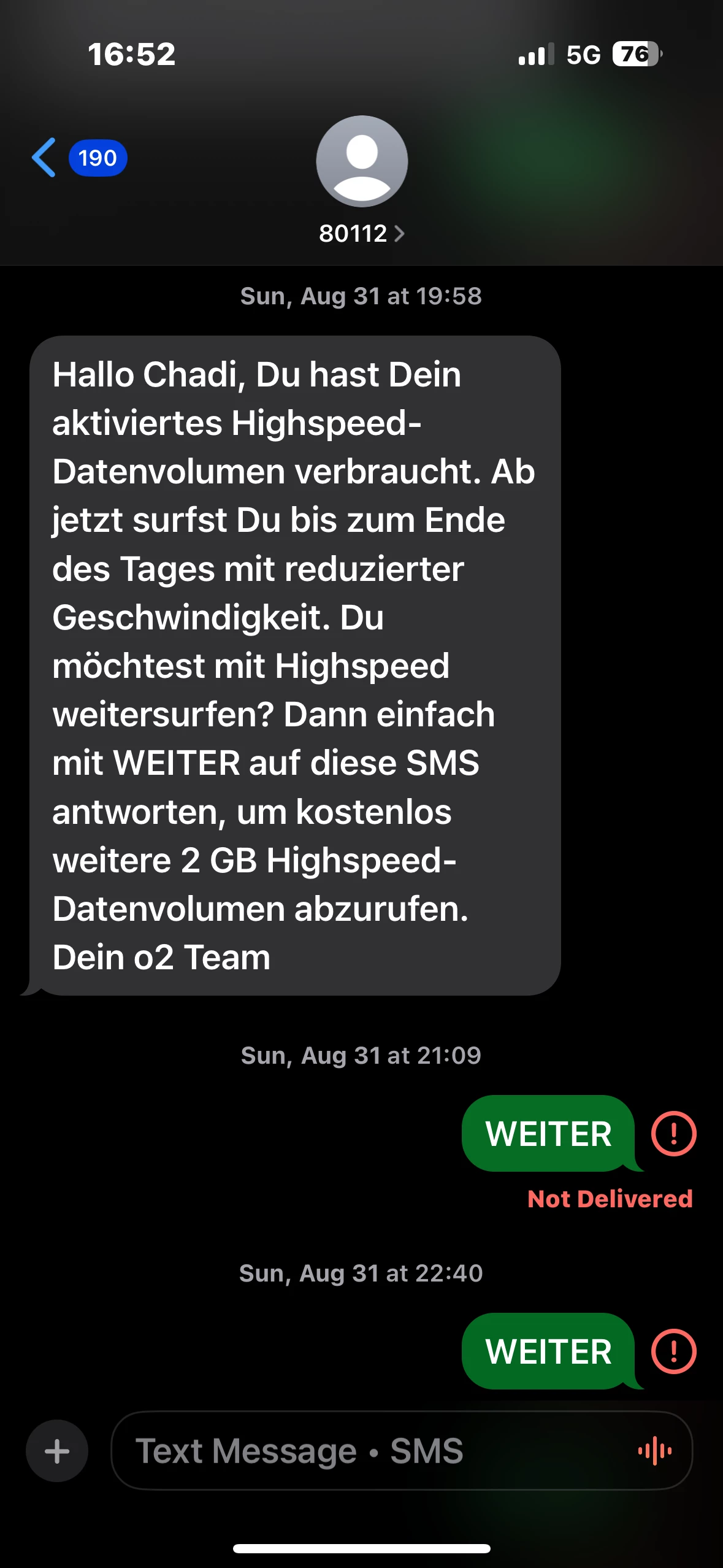 Ich habe seit einem Monat ein Problem: Mein Tarif ist offen, und normalerweise verlängere ich mein Datenvolumen (10 GB) mit der SMS “WEITER”. Jetzt erhalte ich die Nachricht, dass das Datenvolumen aufgebraucht ist, aber wenn ich mit “WEITER” antworten will, wurde dieses SMS nicht geschickt. Kann jemand mir sagen was soll ich machen.