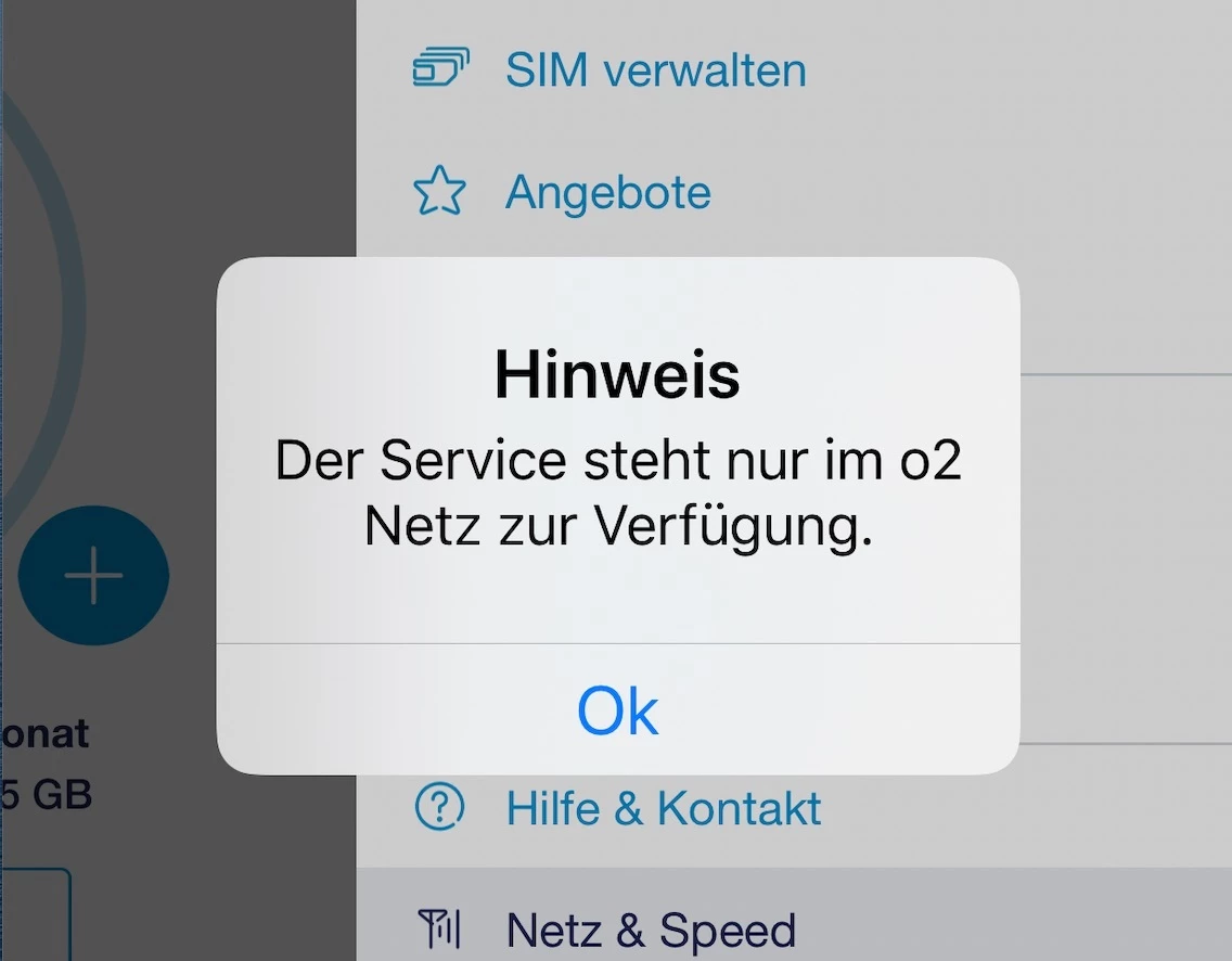 und wenn ich in der normalen o2 App mit vollem 3g Empfang im o2 Netz auf “Netz & Speed” klicke kommt folgende Fehlermeldung “Hinweis Der Service steht nur im o2 Netz zu Verfügung” ich hänge auch noch ein Foto an. Über WLAN aus dem Festnetz der Telekom funktioniert es, muss man nicht verstehen.