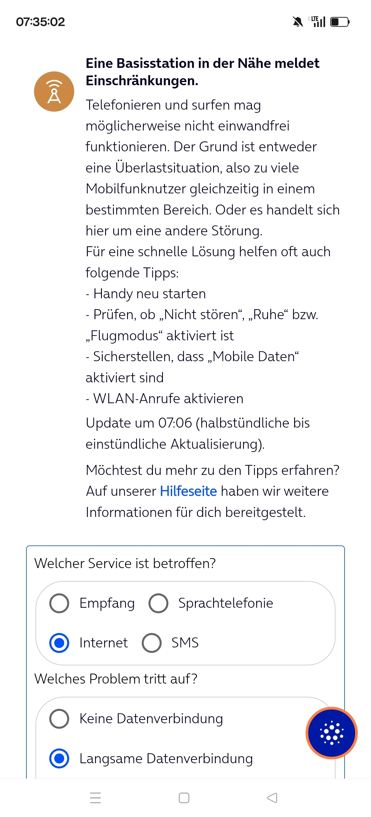 genau die Anzeige spiegelt Dein Problem wider. Ich kenne das, Entstörungsnachricht bekommen und sofort wieder eine Einschränkung. Bei dir sieht es wohl so aus das zu viele parallel auf Mobilfunk zugreifen, heisst es wurde entstört und sofort wieder in eine Überlast gegangen.