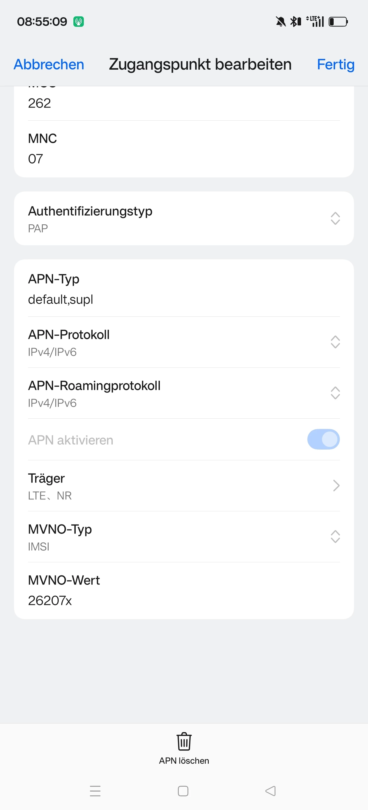 edit, und am Smartphone selbst, in den Einstellungen des Zugangspunkt, musst du nichts ändern, daran liegt es nicht.