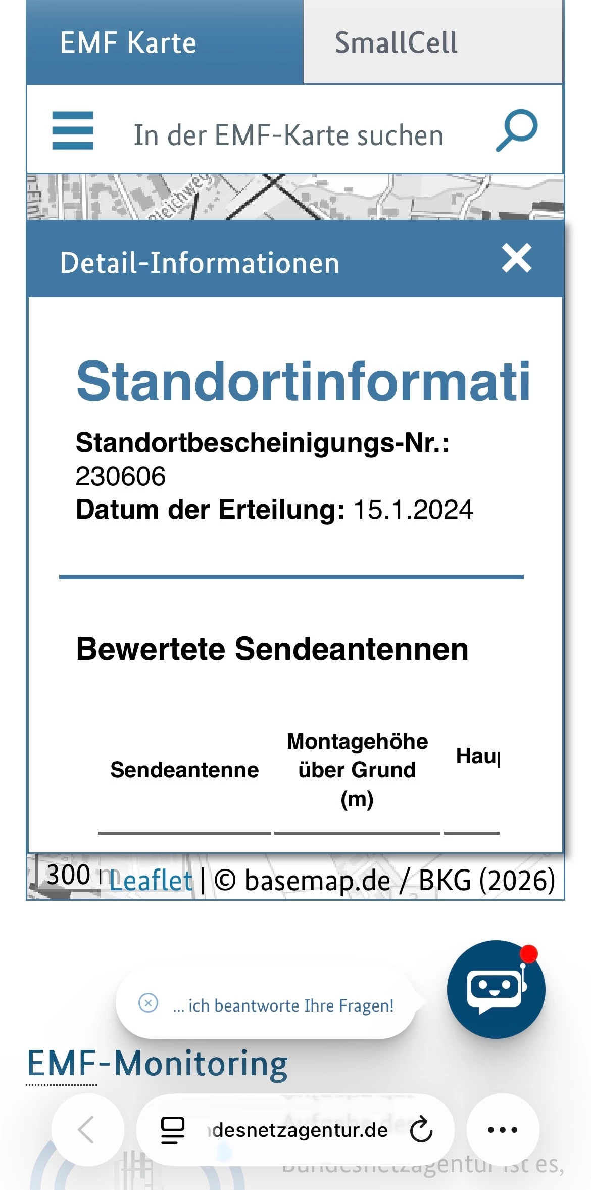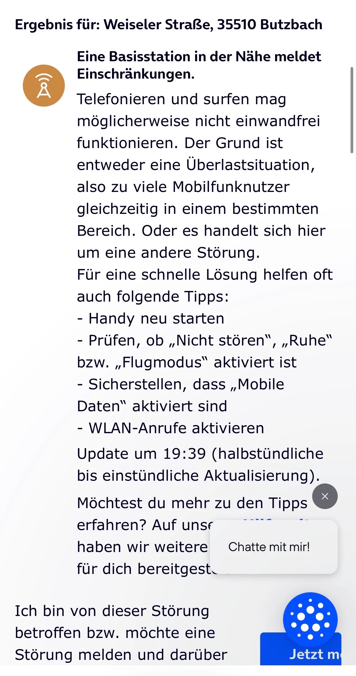 Dabei wohne ich laut EMF-Karte der Bundesnetzagentur nur 300m vom nächsten O2-Funkmast (Martelgasse 9, 35510 Butzbach).