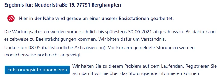 An dieser Postleitzahl laufen auch gerade Wartungsarbeiten, die bis 30. Juni andauern sollen: