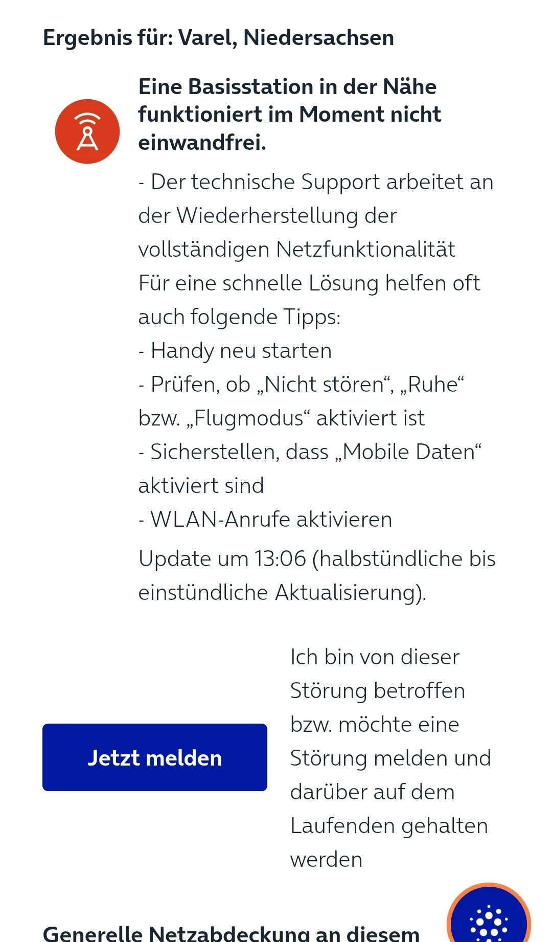 Bei mir zuhause habe ich im Haus immer wieder Gesprächs Abbrüche. Im Garten ist es etwas besser. Wenn ich in Varel unterwegs bin, habe ich oft kein Netz und kann nicht anrufen. Wenn ich außerhalb bin, funktioniert alles einwandfrei. Die Störung vom Juli besteht seitdem durchgehend.