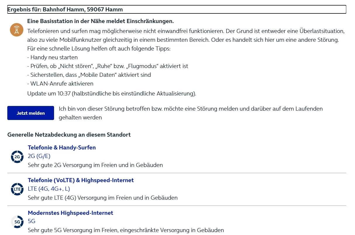 für den Bahnhof wird in unserem Live-Check eine Einschränkung unseres Netzes angezeigt: