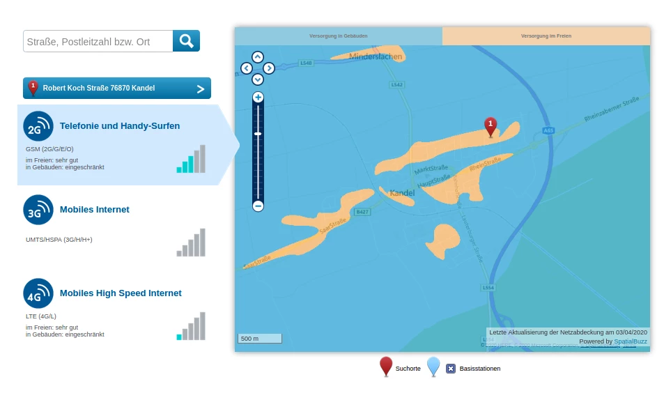 für mich sieht das weniger nach einer Netzstörung aus. Ich vermute, dass hier der bisherige Standort “Robert Koch Straße 76870 Kandel” (GSM / UMTS) abgebaut werden musste, denn dieser ist nicht mehr in der Netzabdeckungskarte von o2 zu finden: