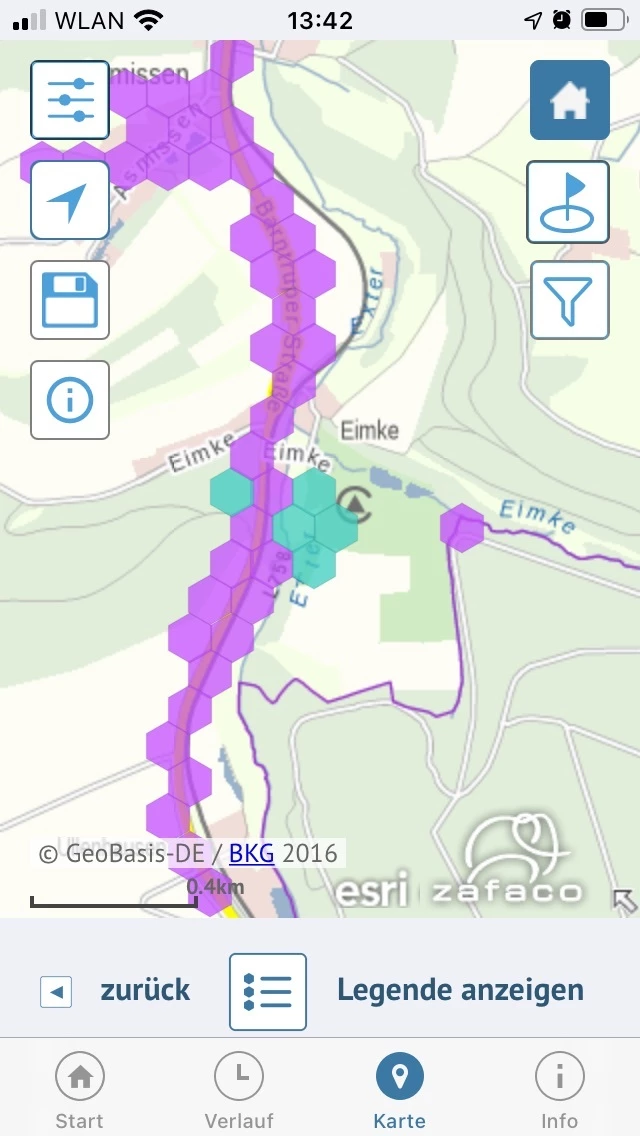 Der Platz liegt in einem funkloch. Lila ist LTE, grüne Kacheln Funkloch