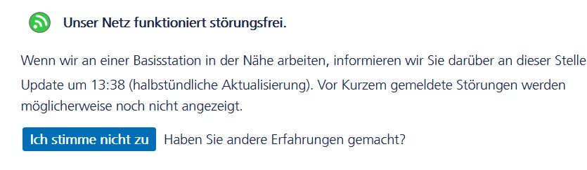 Der Live-Check zeigt seit mindestens 3 Wochen den Status: Eine Basisstation in der Nähe meldet Einschränkungen. In der App gibt es nach dem Check leider keine Möglichkeit eine Störung zu melden ...“