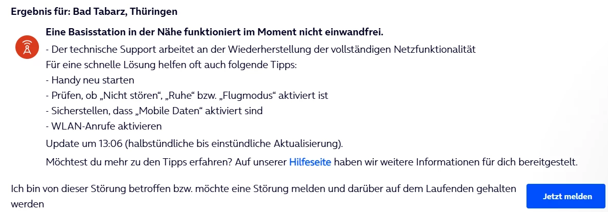 Ich konnte einmal für die für Tabarz in unserem Live Check angezeigte Störung nachschauen, ​@Mikesch21, diese ist für unsere in Waltershausen stehende Station angezeigt, welche auch Tabarz versorgt.