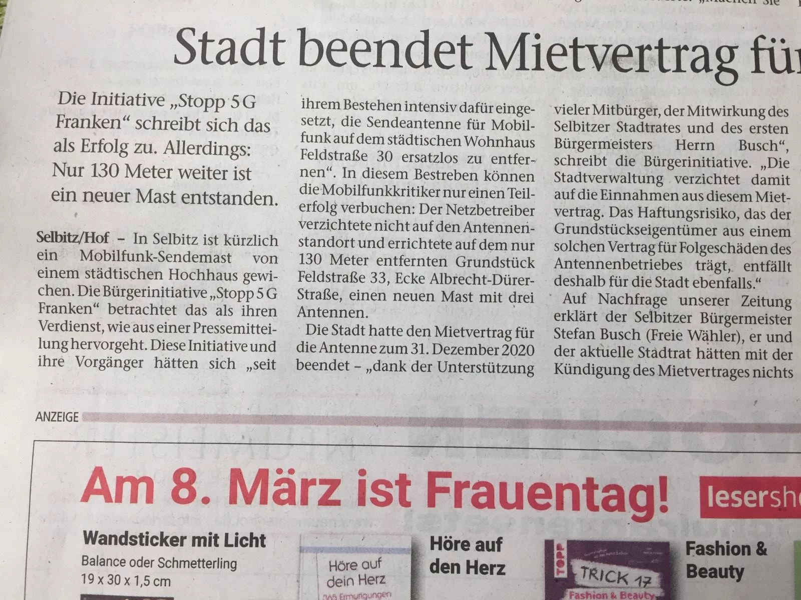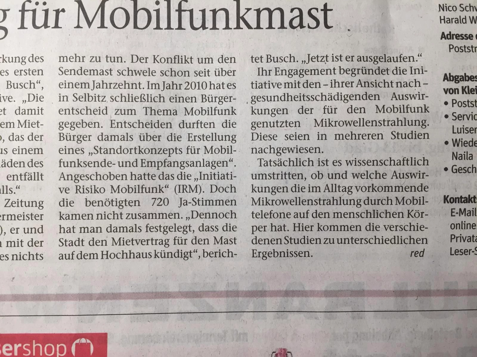 Nur ein Teil des Artikels. Der Bürgerentscheid fiel „für“ Mobilfunk aus. Trotzdem wurde 2010 entschieden das der Pachtvertrag nicht verlängert wird. Schwarz auf weiß.